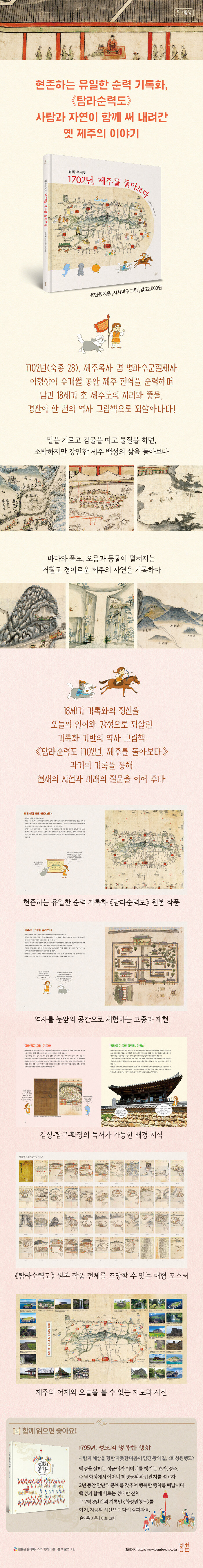 ¡ºÅ½¶ó¼ø·Âµµ 1702³â, Á¦ÁÖ¸¦ µ¹¾Æº¸´Ù¡»´Â ±× ¿À·¡µÈ ±â·ÏÀ» ¿À´Ã³¯ µ¶ÀÚÀÇ ´«³ôÀÌ¿¡ ¸Â°Ô »õ·Ó°Ô ±¸¼ºÇÑ ¡®±â·ÏÈ ±â¹Ý ¿ª»ç ±×¸²Ã¥¡¯ÀÌ´Ù. 20°³ÀÇ ÁÖ¿ä ¿øº» ±×¸²À» ¼±º°ÇØ ½Ã°£ÀÇ È帧¿¡ ¸ÂÃç ¿«¾ú´Ù. µ¶ÀÚÀÇ ¸ôÀÔÀ» µ½±â À§ÇØ ±â·ÏÀÇ ÁÖüÀÎ ÀÌÇü»óÀ» 1ÀÎĪ ÈÀÚ·Î ¼³Á¤ÇØ ¼»ç¸¦ À̲ö´Ù. Á¦ÁÖ ¼Ò³â °³¶ËÀÌ¿Í ÀÌÇü»óÀÇ ¹Ý·Á°ß »ð»ç¸® µî °¡»óÀÇ Àι°µéÀ» µîÀå½ÃÄÑ ±×¸²°ú À̾߱â, ÇØ¼³ÀÌ À¯±âÀûÀ¸·Î ¸Â¹°¸®µµ·Ï ±¸¼ºÇß´Ù.