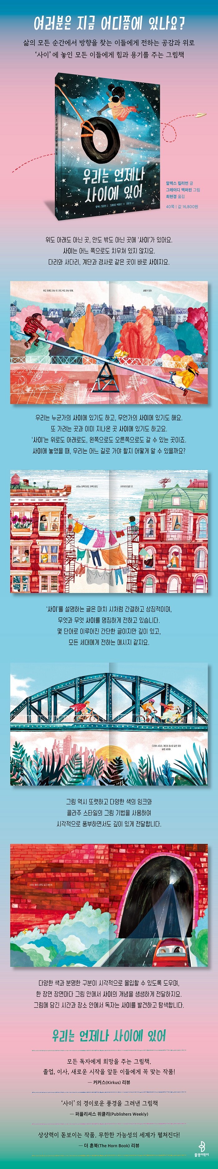 ¡¶¿ì¸®´Â ¾ðÁ¦³ª »çÀÌ¿¡ À־´Â »îÀÇ ¸ðµç ¼ø°£ Á¸ÀçÇÏ´Â ¡®»çÀÌ¡¯¿¡ °üÇÑ ±×¸²Ã¥ÀÔ´Ï´Ù. ¾î¸°À̵é»Ó¸¸ ¾Æ´Ï¶ó »îÀÇ Àüȯ±â¸¦ °Þ´Â ¸ðµç »ç¶÷¿¡°Ô ÀüÇÏ´Â À̾߱âÀ̱⵵ ÇÏÁö¿ä. ¶§·Î´Â ³Ê¹«µµ ±æ°í ¾îµÓ±âµµ Çϰí, °¡·Á´Â °÷°ú ÀÌ¹Ì Áö³ª¿Â °÷ »çÀÌ¿¡ Àֱ⵵ ÇÏÁö¸¸ ¡®»çÀÌ¡¯´Â ºÒÈ®½ÇÇÑ °ÍÀ» ¸»ÇÏ´Â °Í¸¸Àº ¾Æ´ÏÁö¿ä. ³«ÇÏ»êÀ» Ÿ°í ¶³¾îÁö°Å³ª ¿±â±¸¸¦ Ÿ°í ¶°¿À¸£´Â °Íó·³, ¶Ç´Â ÇØ¾È »çÀ̸¦ Ç×ÇØÇÏ´Â °Íó·³, »ê°ú »ê »çÀÌ °ñÂ¥±â¸¦ °È´Â °Íó·³ ºÐ¸íÇÏ°Ô ³ª¾Æ°¡´Â ¹æÇâÀ» ¾Ë·ÁÁֱ⵵ ÇØ¿ä. ÀÌ Ã¥Àº ±×·¸°Ô ½Ã°£°ú °ø°£ÀÇ »çÀ̸¦ ¼¶¼¼ÇÏ°Ô ±×·Á³»°í ÀÖ½À´Ï´Ù. ¿ì¸®ÀÇ ¿©Á¤À» ÇÔ²²ÇÏ´Â °Í󷳿ä.