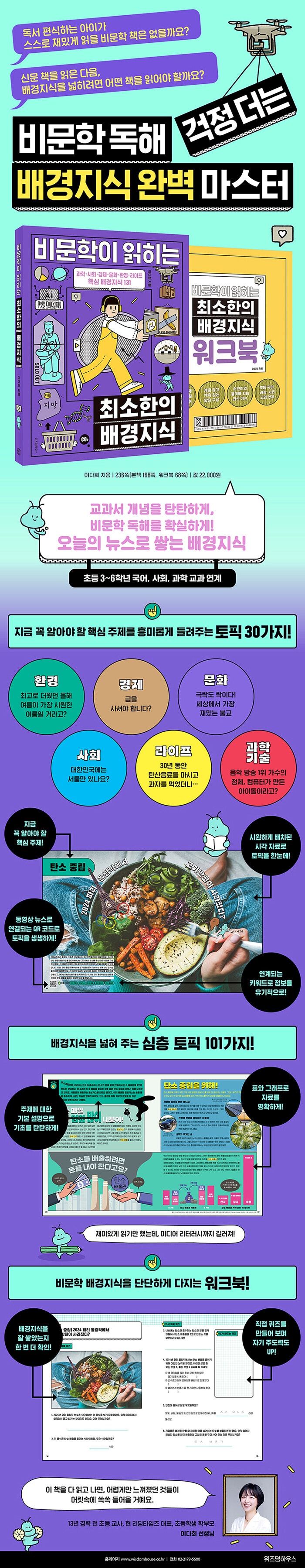 ÀÌ Ã¥¿¡ ±ÛÀ» ¾´ ÀÌ´ÙÈñ ¼±»ý´ÔÀº 13³â µ¿¾È ±³»ç·Î ±Ù¹«ÇÑ °æÇè°ú ¡®¿ÍµðÁî ÆÝµù¡® ¾Æµ¿ ±³À° ºÐ¾ß ¿ª´ë 1À§¸¦ ±â·ÏÇÑ ¡´ÇÏ·ç ÇÑ Àå ŰÁî ½Å¹®¡µÀ» ¹ßÇàÇÏ¸ç ¾òÀº ³ëÇϿ츦 ¹ÙÅÁÀ¸·Î ÃֽŠÀ̽´¿¡¼ ¼ö´É ºñ¹®Çаú ³í¼ú ÁÖÁ¦¿¡ ´Ü°ñ·Î ³ª¿À´Â ÁÖÁ¦µéÀ» ²Å¾Æ ¾î¸°ÀÌ ´«³ôÀÌ¿¡ ¸ÂÃç ´ã¾Ò´Ù. ¡®È¯°æ, »çȸ, °æÁ¦, ¶óÀÌÇÁ, ¹®È, °úÇÐ ±â¼ú¡¯ 6°¡Áö ºÐ¾ß¿¡¼ °¡Àå Áß¿äÇÑ ÇÙ½É ÁÖÁ¦ 5°¡Áö¾¿À» °ñ¶ú°í, °¢ ÁÖÁ¦¿¡ ´ëÇÑ ¹è°æÁö½ÄÀ» Ű¿ö ÁÖ´Â 131°¡ÁöÀÇ ÅäÇÈÀ» ´Ùä·Ó°í Èï¹Ì·Ó°Ô ³Ö¾ú´Ù. °¢ ÁÖÁ¦ÀÇ Ã¹ ÆäÀÌÁö¿¡´Â ¡®ÃÖ°í·Î ´õ¿ü´ø ¿ÃÇØ ¿©¸§ÀÌ °¡Àå ½Ã¿øÇÑ ¿©¸§ÀÏ °Å¶ó°í?¡¯, ¡®´ëÇѹα¹¿¡´Â ¼¿ï¸¸ ÀÖ³ª¿ä?¡¯Ã³·³ ÁÖÁ¦¸¦ ´ëÇ¥ÇÏ´Â Èï¹Ì·Î¿î ÅäÇȰú ½Ã°¢ ÀڷḦ ³Ö¾î ¾î¸°ÀÌÀÇ È£±â½ÉÀ» µ¸¿ì·Á Çß°í, ÀÌ¾î¼ Á¤Ä¡, »çȸ, °æÁ¦ µî ÁÖÁ¦¸¦ ´Ù¹æ¸éÀ¸·Î º¸¿© ÁÖ´Â ÅäÇÈÀ» ´ã¾Æ °¢ ÁÖÁ¦¿¡ ´ëÇÑ ½Ã¾ß¸¦ È®ÀåÇØ ÁÖ·Á Çß´Ù. ¡®Æø¿°¡¯ ÁÖÁ¦¿¡¼ ¿Â¿ ÁúȯÀÚ ±ÞÁõ°ú µ¿¹° Æó»ç µî ¹«´õÀ§·Î ÀÏ¾î³ »çȸ Çö»ó, ³óÀÛ¹° ¼öÈ®·® °¨¼Ò·Î À̾îÁø »ýȰ º¯È, Àç³ ¹®ÀÚ³ª ±×´Ã¸· ¼³Ä¡ °°Àº Á¤ºÎ Á¤Ã¥À» ´Ù·ç¾úµí ¸»ÀÌ´Ù. ¶ÇÇÑ °¢ ÁÖÁ¦¿Í ¿¬°áµÈ Ű¿öµåµµ Á¤¸®ÇØ µÎ¾î Ű¿öµåµéÀÌ ¾î¶² »óȲ¿¡¼ ¾²ÀÌ´ÂÁö ¾î¸°À̵éÀÌ ½±°Ô ÀÌÇØÇÒ ¼ö ÀÖ´Ù. ÃʵîÇб³ 3ÇгâºÎÅÍ 6Çгâ±îÁö ±¹¾î, »çȸ, °úÇÐ ±³°ú¿Í ±ä¹ÐÈ÷ ¿¬°áµÈ ³»¿ëµéÀº ±³°ú¼¿Í ´Ù¸¥ ºñ¹®ÇÐ Áö¹®µéÀ» À̾î ÁÖ´Â ¿¬°á °í¸®°¡ µÇ¾î ÁÙ °ÍÀÌ´Ù.