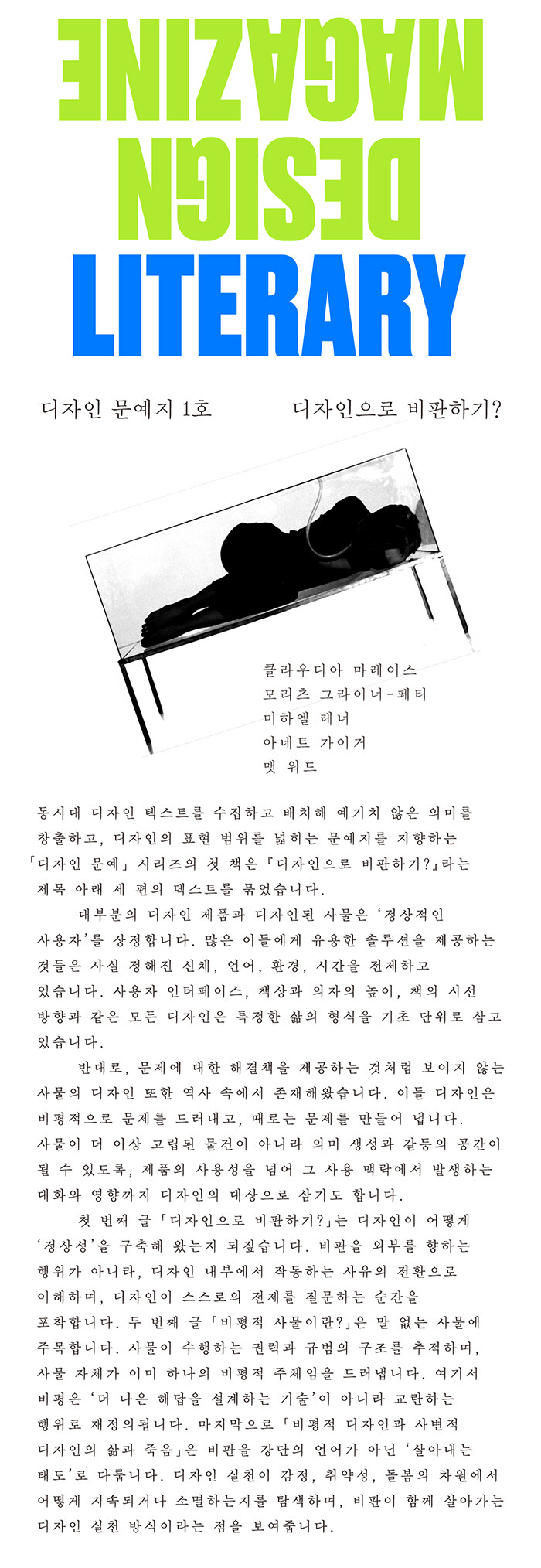 µ¿½Ã´ë µðÀÚÀÎ ´ã·ÐÀÇ È帧 ¼Ó¿¡¼ ÁÖ¸ñÇÒ ¸¸ÇÑ ÅØ½ºÆ®µéÀ» µð±ëÇÏ°í ¼öÁýÇÏ´Â ¡¸µðÀÚÀÎ ¹®¿¹¡¹ 1È£. ½Ã´ë¿Í À帣¸¦ °¡·ÎÁö¸£´Â µðÀÚÀÎÀÇ »ý°¢°ú ½ÇõÀ» ¸ð¾Æ »õ·Î¿î ¸Æ¶ô¿¡ ¹èÄ¡Çϸç, ¼·Î ´Ù¸¥ ¹®ÀåµéÀÌ ¸Â´ê´Â ÀÚ¸®¿¡¼ »ý°Ü³ª´Â ¿¹±âÄ¡ ¾ÊÀº ¿ï¸²À» ÅëÇØ µðÀÚÀÎÀÌ Ç¥ÇöÇÒ ¼ö ÀÖ´Â ¹üÀ§¿Í ¹Ì·¡ÀÇ °¡´É¼ºÀ» È®ÀåÇϰíÀÚ ÇÑ´Ù.