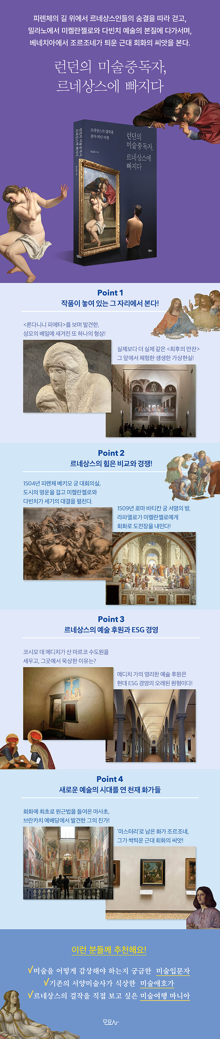ÀÌ Ã¥Àº ÁÖ·Î ÀÌÅ»¸®¾Æ ¸£³×»ó½º ¹Ì¼úÀ» ´Ù·çÁö¸¸, ÀÛǰ»Ó¸¸ ¾Æ´Ï¶ó ½Ã´ëÀÇ ºÐÀ§±â¿Í »ç¶÷µéÀÇ À̾߱⵵ ÇÔ²² ´ã¾Æ³½´Ù. ¿ì¼± ÀúÀÚ´Â ÀÌÅ»¸®¾Æ ¸£³×»ó½º°¡ ½ÃÀÛµÈ ÇÇ·»Ã¼ÀÇ »çȸ ¹®ÈÀû ºÐÀ§±â¸¦ »ìÆìº¸¸ç, ¿¹¼ú ¹ßÀüÀÇ ¿øµ¿·ÂÀ̾ú´ø ¡®ºñ±³¿Í °æÀÀÇ ¹®È, ±×¸®°í Äڽø𠵥 ¸ÞµðÄ¡¸¦ Áß½ÉÀ¸·Î ¿¹¼ú ÈÄ¿øÀÇ ÀüÅëÀÌ ¾î¶»°Ô µµ½ÃÀÇ ¹®ÈÀû ±â¹ÝÀ» ¸¸µé¾î°¬´ÂÁö¸¦ º¸¿©ÁØ´Ù. ÀÌ¾î¼ ¸£³×»ó½º ¿¹¼úÀÌ Ãß±¸ÇÑ ¸ñÇ¥¿Í ±× È帧 ¼Ó¿¡¼ ¿¹¼úÀÇ ÆÐ·¯´ÙÀÓÀ» ¹Ù²Û ¿¹¼ú°¡µé, À̸¦Å׸é ȸȿ¡ ÃÖÃÊ·Î ¿ø±Ù¹ýÀ» µµÀÔÇÑ ¸¶»çÃÊ, ½ÇÁ¦º¸´Ù ´õ ½ÇÁ¦ °°Àº Çö½ÇÀ» âÁ¶ÇÑ ·¹¿À³ª¸£µµ ´ÙºóÄ¡, ±×¸®°í ÃÊ»óÈ¿¡ °³ÀÎÀÇ ³»¸é°ú ½É¸®±îÁö ´ã¾Æ³½ Á¶¸£Á¶³×¸¦ Á¶¸íÇÑ´Ù. ¸¶Áö¸·À¸·Î ¿À´Ã³¯ ¿ì¸®ÀÇ ½Ã¼±¿¡¼ »õ·Ó°Ô ¹ß°ßµÇ°í ÀçÆò°¡µÈ ÀÛǰ°ú ÀÛ°¡µéÀ» »ìÆìº»´Ù. ¹Ì¿Ï¼ºÀÛÀ¸·Î ¿À·§µ¿¾È Á¦´ë·Î Æò°¡¹ÞÁö ¸øÇÑ ¹ÌÄ̶õÁ©·ÎÀÇ ¡´·Ð´Ù´Ï´Ï ÇÇ¿¡Å¸¡µ, ½Ã´ë¸¦ ¾Õ¼°£ ¿©¼º Ȱ¡ ¾Æ¸£Å׹̽þư¡ ±× ÁÖÀΰøÀÌ´Ù. Ã¥ÀÇ ¸»¹Ì¿¡´Â À§ÀÛ¿¡¼ ÁøÀÛÀ¸·Î º¹±ÇµÈ ÀÛǰµéÀÇ »ç·Ê¸¦ ´Ù·ç¸ç, ¿¹¼úǰÀÇ ÁøÀ§ ÆÇº°°ú °¡Ä¡ ±âÁØ¿¡ ´ëÇØ Áú¹®À» ´øÁø´Ù.
