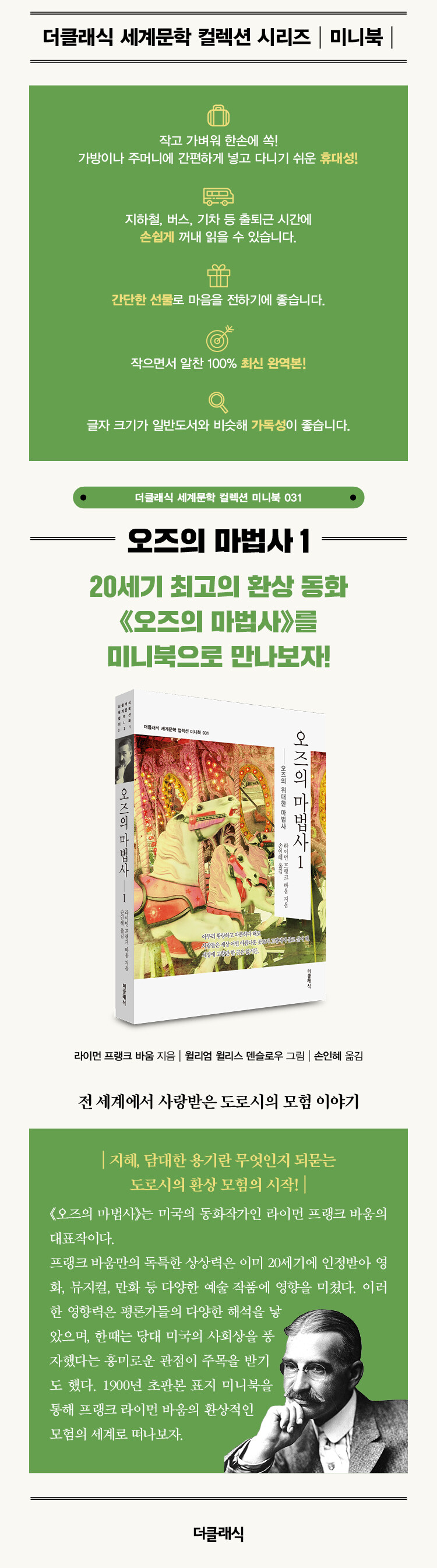 1856³â ¹Ì±¹ ´º¿åÀÇ Ä¡Æ°¾Þ°í¿¡¼ ž´Ù. µ¿È ÀÛ°¡°¡ µÇ±â Àü¿¡ ¿©·¯ °¡Áö Á÷¾÷À» °¡Á³¾ú´Âµ¥ ¹è¿ì, ½Å¹®±âÀÚ, Á¡¿ø, ¿ÜÆÇ¿ø µîÀ» ÇÏ´Ù°¡ ÀâÁö»çÀÇ ÆíÁýÀåÀ¸·Î ÀÏÇß´Ù. 40»ìÀÌ µÇ¾î ¹Ù¿òÀº ½ÃÁý°ú µ¿ÈÃ¥µéÀ» ¾²±â ½ÃÀÛÇß´Ù. 1898³â ½ÃÄ«°í¿¡¼ W. W. µ§½½·Î¿ì¸¦ ¸¸³ª 'ĵµé¶óºê¶óÀÇ ½Ã¼±À¸·Î'¶ó´Â ½ÃÁýÀ» ¸¸µé°í, '°ÅÀ§ ¾Æ¹öÁö : ±×ÀÇ Ã¥'À̶ó´Â µ¿½ÃÁýÀ» ¸¸µé¾î Å« Àα⸦ ¸ð¾Ò´Ù. ÀÌ ¼º°ø¿¡ ÈûÀÔ¾î µÎ »ç¶÷Àº 1900³â 'À§´ëÇÑ ¸¶¹ý»ç ¿ÀÁî'¸¦ ÃâÆÇÇß´Ù. ¹Ù¿òÀÇ ½Å±âÇϰí Àç¹ÌÀÖ´Â À̾߱â¿Í ±×ÀÇ ¸íÄÞºñÀÎ µ§½½·Î¿ìÀÇ ¶Ù¾î³ ±×¸²Àº ÀÌ Ã¥À» ±× ÇØÀÇ º£½ºÆ®¼¿·¯·Î ¸¸µé¾ú´Ù. ÀÌ ÈǸ¢ÇÑ µ¿ÈÃ¥Àº ±× ÀÌÈÄ¿¡ ¿¬±Ø, ¿µÈ, TV ¿¬¼Ó¹°, ¿Â°® ¼±¹°¿ëǰÀ¸·Î ¸¸µé¾îÁ® 100³âÀÌ Áö³ Áö±Ý±îÁöµµ ¾î¸°À̵é¿Í ¾î¸¥µé¿¡°Ô ¿·ÄÇÑ »ç¶ûÀ» ¹Þ°í ÀÖ´Ù. ¹Ù¿òÀº ÀÌ Ã¥ÀÇ Ãâ°£ ÈÄ¿¡ ÈļӯíÀ» ±â´Ù¸®´Â ¾î¸°À̵éÀÇ »ê´õ¹Ì °°Àº ÆíÁö¸¦ ¹Þ°í °è¼ÓÇØ¼ ¿ÀÁî ½Ã¸®Á ¾µ ¼ö¹Û¿¡ ¾ø¾ú´Ù. ±× Ã¥µéÀº ÇѰᰰÀÌ Àç¹ÌÀÖÀ¸¸ç ÇöÀç±îÁöµµ Àü¼¼°èÀÇ ¸íÀÛ°íÀüÀ¸·Î ³Î¸® ÀÐÇôÁö°í ÀÖ´Ù. 1919³â 5¿ù 6ÀÏ ¼¼»óÀ» ¶°³µ´Ù.