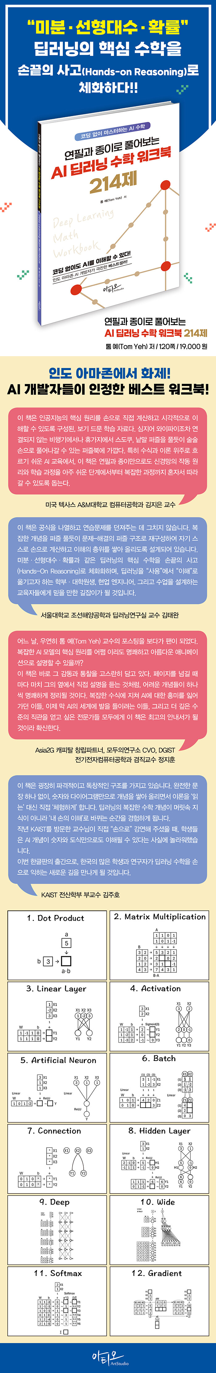 ÀÌ Ã¥Àº ÀΰøÁö´ÉÀÇ ÇÙ½É ¿ø¸®¸¦ ¼ÕÀ¸·Î Á÷Á¢ °è»êÇÏ°í ½Ã°¢ÀûÀ¸·Î ÀÌÇØÇÒ ¼ö ÀÖµµ·Ï ±¸¼ºµÈ, º¸±â µå¹® ÇнÀ ÀÚ·á´Ù. ½ÉÁö¾î ¿ÍÀÌÆÄÀÌÁ¶Â÷ ¿¬°áµÇÁö ¾Ê´Â ºñÇà±â¿¡¼³ª ÈÞ°¡Áö¿¡¼ ½ºµµÄí, ³¹¸» ÆÛÁñÀ» Ç®µíÀÌ ¼ú¼ú ¼ÕÀ¸·Î Ç®¾î³ª°¥ ¼ö ÀÖ´Â ÆÛÁñºÏ¿¡ °¡±õ´Ù. ƯÈ÷ ¼ö½Ä°ú ÀÌ·Ð À§ÁÖ·Î È帣±â ½¬¿î AI ±³À°¿¡¼, ÀÌ Ã¥Àº ¿¬Çʰú Á¾À̸¸À¸·Îµµ ½Å°æ¸ÁÀÇ ÀÛµ¿ ¿ø¸®¿Í ÇнÀ °úÁ¤À» ¾ÆÁÖ ½¬¿î ´Ü°è¿¡¼ºÎÅÍ º¹ÀâÇÑ °úÁ¤±îÁö È¥ÀÚ¼ µû¶ó°¥ ¼ö ÀÖµµ·Ï µ½´Â´Ù.