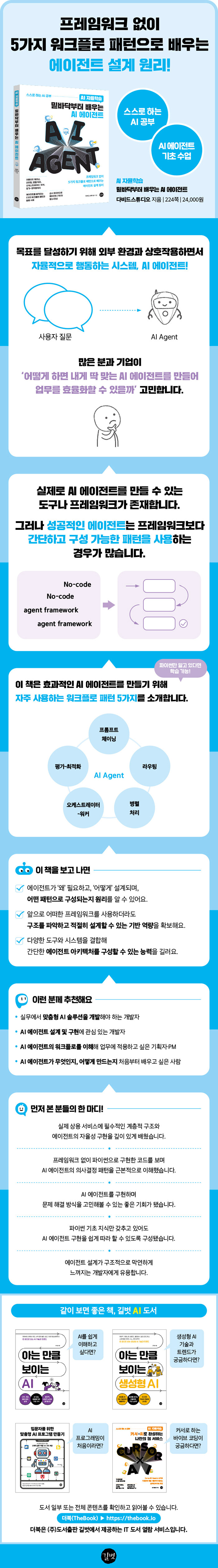 AI ±â¾÷ ¾ØÆ®·ÎÇÈÀº '¼º°øÀûÀÎ ¿¡ÀÌÀüÆ®´Â º¹ÀâÇÑ ÇÁ·¹ÀÓ¿öÅ©º¸´Ù °£´ÜÇÏ°í ±¸¼º °¡´ÉÇÑ ÆÐÅÏÀ» »ç¿ëÇÏ´Â °æ¿ì°¡ ¸¹´Ù'°í Çß½À´Ï´Ù. AI ¿¡ÀÌÀüÆ®¸¦ ¸¸µé ¶§ µµ±¸³ª ÇÁ·¹ÀÓ¿öÅ©¸¦ »ç¿ëÇÏ´Â °Íµµ ¹æ¹ýÀÌÁö¸¸ ¿öÅ©Ç÷ΠÆÐÅÏÀ» ÀÌÇØÇϰí Ȱ¿ëÇÏ´Â °ÍÀÌ ¹«¾ùº¸´Ù Áß¿äÇÕ´Ï´Ù. Ã¥¿¡¼´Â ³»ºÎ ÀÛµ¿ ¿ø¸®°¡ Ãß»óÈµÈ ÇÁ·¹ÀÓ¿öÅ©¸¦ »ç¿ëÇÏÁö ¾Ê°í ¼ø¼ö ÆÄÀ̽ãÀ¸·Î ¿¡ÀÌÀüÆ®¸¦ ±¸ÇöÇÕ´Ï´Ù. LLMÀ» ¾î¶»°Ô È£ÃâÇÏ´ÂÁö, µ¥ÀÌÅͰ¡ ¾î¶»°Ô È帣´ÂÁö, °¢ ´Ü°è°¡ ¾î¶»°Ô ¿¬°áµÇ´ÂÁö¸¦ ´«À¸·Î º¸°í ¼ÕÀ¸·Î ¸¸Áö¸ç üµæÇÒ ¼ö ÀÖ½À´Ï´Ù. AI ¿¡ÀÌÀüÆ®¸¦ ¿ÏÀüÈ÷ Àå¾ÇÇÏ¸ç ±¸ÇöÇØº¸´Â °æÇè, ÀÌ Ã¥À¸·Î ½ÃÀÛÇØ º¸¼¼¿ä.