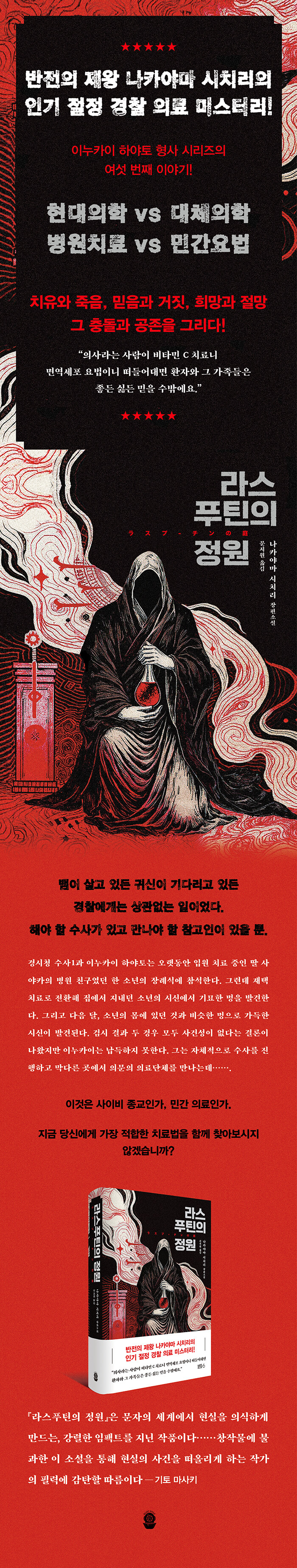 ¡º¶ó½ºÇªÆ¾ÀÇ Á¤¿ø¡»Àº ³ªÄ«¾ß¸¶ ½ÃÄ¡¸®°¡ ¼±º¸ÀÌ´Â °æÂû ÀÇ·á ¹Ì½ºÅ͸®·Î, ÀÌ´©Ä«ÀÌ ÇϾßÅä Çü»ç ½Ã¸®ÁîÀÇ ¿©¼¸ ¹øÂ° ÀÛǰÀÌ´Ù. À̹ø ÀÛǰÀÇ Å« ÁÖÁ¦´Â Çö´ëÀÇÇаú ´ëüÀÇÇÐ, º´¿ø Ä¡·á¿Í ¹Î°£¿ä¹ýÀ» µÑ·¯½Ñ °¥µîÀ̶ó°í ÇÒ ¼ö ÀÖ´Ù. ÁٰŸ®¸¦ °£´ÜÈ÷ »ìÆìº¸ÀÚ¸é ´ÙÀ½°ú °°´Ù. °æ½Ãû ¼ö»ç1°ú Çü»ç ÀÌ´©Ä«ÀÌ ÇϾßÅä´Â µþ »ç¾ßÄ«¿Í ÇÔ²² º´¿ø¿¡ ÀÔ¿øÇØ ÀÖ´ø ÇÑ ¼Ò³âÀÇ °©ÀÛ½º·¯¿î Åð¿ø ¼Ò½ÄÀ» µè´Â´Ù. ±×¸®°í ¾ó¸¶ ÈÄ, ±× ¼Ò³âÀÇ »ç¸Á ¼Ò½ÄÀÌ ÀüÇØÁø´Ù. µþ »ç¾ßÄ«ÀÇ ºÎŹÀ¸·Î ÇÔ²² Àå·Ê½Ä¿¡ Âü¼®ÇÑ ÀÌ´©Ä«ÀÌ´Â ¸¶Áö¸· ÀÛº° Àλ縦 ³ª´©´Â ¼ø°£ °íÀÎÀÇ ¸ö¿¡¼ ¼ö»óÇÑ ¸Û ÀÚ±¹À» ¹ß°ßÇϰí, ¼Ò³âÀÇ Á×À½ÀÌ ´Ü¼øÇÑ º´»ç°¡ ¾Æ´Ï¶ó´Â »ç½ÇÀ» Á÷°¨ÇÑ´Ù. ÀÌ´©Ä«ÀÌ´Â Àǹ®À» ǰ°í ÀÚüÀûÀ¸·Î ¼ö»ç¿¡ Âø¼öÇÑ´Ù. ±×·±µ¥ ÇÑ ´Þ µÚ, ÇÑ °ø¿ø¿¡¼ ¹ß°ßµÈ ÀÚ»ìÇÑ ¿©¼º ½Ã½Å¿¡¼ ¼Ò³âÀÇ ¸ö¿¡ ÀÖ´ø °Í°ú °°Àº ¸ÛÀÌ ¹ß°ßµÇ°í, µÎ »ç°ÇÀÇ ¿¬°á°í¸®¸¦ ã´ø ÀÌ´©Ä«ÀÌ´Â ´ëüÀÇÇÐÀ» ³»¼¼¿ì´Â ÇÑ ¹Î°£ ÀÇ·á´Üü¿Í ¸¶ÁÖÇÏ°Ô µÈ´Ù. ±×¸®°í »ç°ÇÀÇ Áø»ó¿¡ ´Ù´Ù¸£°Ô µÇ´Âµ¥¡¦¡¦