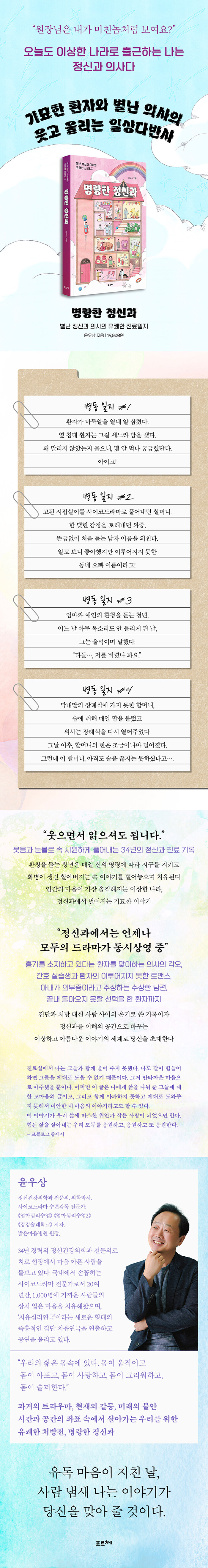 Á¤½Å°Ç°ÀÇÇÐÀº ÀÇÇÐÀÌÁö¸¸ µ¿½Ã¿¡ °ü°èÀÇ ¿¹¼úÀÌ´Ù. ÀÇ»ç¿Í ȯÀÚ, ȯÀÚ °¡Á·°ú °£È£»çµéÀº ¼·Î¸¦ ´ÜÁ¤ ÁþÁö ¾ÊÀ½À» ÅëÇØ Á¶±Ý¾¿ ³ª¾Æ°£´Ù. ÀÌ °úÁ¤À» ÅëÇØ ¸¶À½Àº »ç¶÷À» ÅëÇØ ³´´Â´Ù´Â °ÍÀ» º¸¿©ÁØ´Ù. ÀúÀÚ´Â °üÂûÀÚÀÌÀÚ Ä¡·áÀڷμ º´µ¿°ú Áø·á½Ç¿¡¼ »çÀÌÄÚµå¶ó¸¶¸¦ ÅëÇÑ Ä¡·á °úÁ¤À» ±â·ÏÇÏ¸é¼ °ü°è°¡ ¸¸µå´Â ÀÛÁö¸¸ È®½ÇÇÑ º¯È¸¦ µé·ÁÁØ´Ù. ±â¹¦ÇÑ È¯ÀÚµé°ú º°³ ÀÇ»çÀÇ À̾߱⸦ ÅëÇØ ³ªµµ ¸ð¸£°Ô ¸¶À½ÀÇ º®À» ³ô¿´´ø ÀÌÀ¯¸¦, ´©±º°¡ÀÇ Áø½É ¾î¸° ÇѸ¶µð°¡ ¾ó¸¶³ª Å« À§·Î°¡ µÉ ¼ö ÀÖ´ÂÁö¸¦ ±ú´Ý°Ô µÈ´Ù. µû¶ó¼ ÀÌ Ã¥Àº »ç¶÷ »çÀÌÀÇ °ü°è°¡ ÁÖ´Â ÈûÀ» ȸº¹½ÃŰ´Â À̾߱âÀ̱⵵ ÇÏ´Ù. Ã¥À» ÀÐÀ¸¸ç ÇѹÙÅÁ ¿ôÀ½°ú ´«¹°À» ½ñ¾Æ ³½ µÚ¿¡´Â °á±¹ µû¶æÇÑ Àΰ£ ÀÌÇØ°¡ ³²´Â´Ù. ³ªÀÇ ¸¶À½ÀÌ ±×·¯ÇÏµí ³ÊÀÇ ¸¶À½µµ ±×·¯Çϸ®¶ó´Â ¼±¸íÇÑ ÀÌÇØ°¡ µé °ÍÀÌ´Ù. <¸í¶ûÇÑ Á¤½Å°ú>´Â ´õ Àΰ£ÀûÀÎ ½Ã¼±À¸·Î ¼¼»óÀ» ¹Ù¶óº¸°Ô ¸¸µå´Â À̾߱â´Ù. µ¶ÀÚ´Â ´©±º°¡ÀÇ ¸¶À½»Ó ¾Æ´Ï¶ó ÀÚ½ÅÀÇ ¸¶À½µµ Á¶±Ý ´õ ¿ÂÀüÈ÷ ÀÌÇØÇÏ°í ´Ùµ¶ÀÌ°Ô µÉ °ÍÀÌ´Ù. º°³ Á¤½Å°ú ÀÇ»çó·³ º¸ÀÌÁö¸¸ ÁøÁöÇÏ°í ±í°í µû¶æÇÑ ÀúÀÚ´Â ÀÌ À̾߱⸦ ÅëÇØ ÀλýÀº ¾î·Æ°í Èûµç °ÍÀÌ ±âº»°ªÀÌ´Ï ¾î¶°ÇÑ ¼ø°£¿¡µµ ¿ì¸® ¡°¸í¶ûÇÏ°Ô »ìÀÚ.¡± ¸»ÇÏ°í ½Í¾ú´ø °Ô ¾Æ´Ò±î? »ç¶÷ »çÀÌÀÇ ¿Â±â·Î ¾´ Á¤½Å°ú Áø·á±â·ÏÀÌÀÚ Á¤½Å°ú¸¦ ÀÌÇØÀÇ °ø°£À¸·Î ¹Ù²Ù´Â ÀÌ»óÇÏ°í ¸í¶ûÇÑ ¼¼°è·Î µ¶ÀÚµéÀ» ÃÊ´ëÇÑ´Ù.