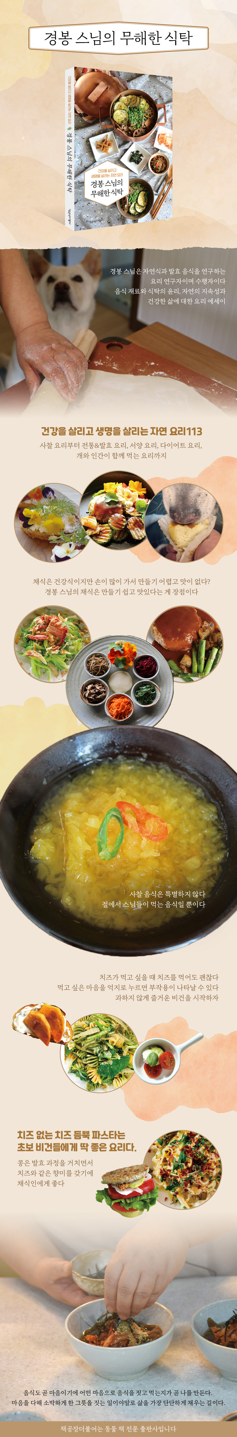 ÀÚ¿¬½Ä°ú ¹ßÈ¿ À½½ÄÀ» ¿¬±¸ÇØ ¿Â ¿ä¸® ¿¬±¸ÀÚÀÌ¸ç ¼öÇàÀÚÀÎ °æºÀ ½º´ÔÀÇ Ã¹ Ã¥ÀÌ´Ù. ¿ä¸®¸¦ ÅëÇØ À½½Ä Àç·á¿Í ½ÄŹÀÇ À±¸®, ÀÚ¿¬ÀÇ Áö¼Ó¼º°ú °Ç°ÇÑ »î¿¡ ´ëÇØ »ý°¢ÇÏ°Ô ÇÏ´Â ¿ä¸® ¿¡¼¼ÀÌ. »çÂû À½½ÄÀº È·ÁÇÏÁö ¾Ê´Ù. Áß¿äÇÑ °ÍÀº Àç·á°¡ ¾îµð¼ ¿Ô´ÂÁö, ±× Àç·á¸¦ ¾î¶»°Ô ´ëÇÏ´ÂÁö, ÀÚ¿¬¿¡ ´ëÇÑ °í¸¶¿òÀÌ ÀÖ´ÂÁö, ¿ä¸®¸¦ ¸¸µå´Â »ç¶÷ÀÇ Á¤¼ºÀÌ ÀÖ´ÂÁöÀÌ´Ù. ½º´ÔÀÇ ¹«ÇØÇÑ ½ÄŹÀº »ç¶÷µéÀÇ ÀÏ»ó¿¡ ÀÛÀº Æòȸ¦ ¼±»çÇÒ °ÍÀÌ´Ù.