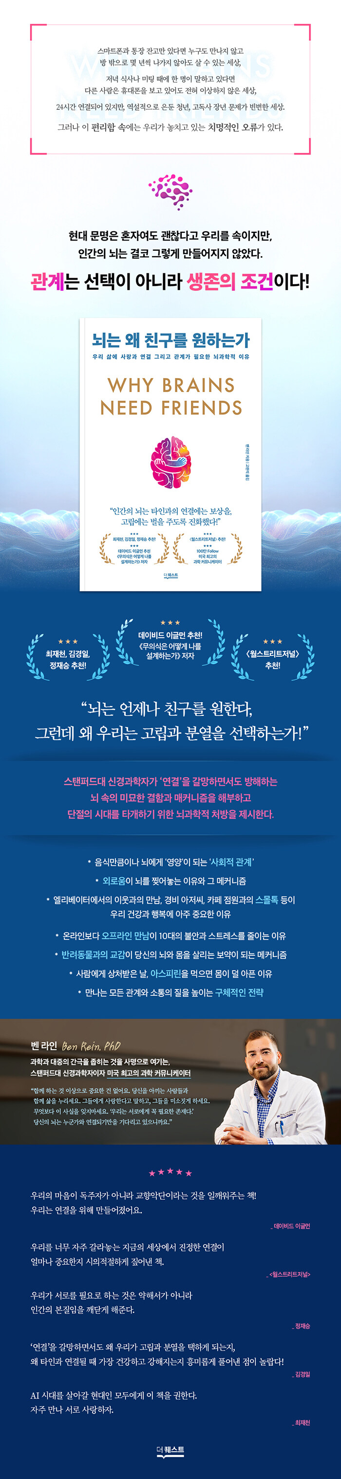 AI¡¤µðÁöÅÐ ±â¼úÀÌ ÀÏ»óÀ» ¿ÏÀüÈ÷ µÚ¹Ù²ã ³õÀº Áö±Ý, ¿ì¸®´Â »ç¶÷µé°úÀÇ ¹°¸®Àû ¸¸³² ¾øÀ̵µ »ì¾Æ°¥ ¼ö ÀÖ´Â ½Ã´ë¸¦ ¸Â¾Ò´Ù. ÇÏÁö¸¸ ¿ª¼³ÀûÀ¸·Î »çȸÀû ¿¬°áÀº ºü¸£°Ô ¾àÇØÁö°í, °í¸³°ú ¿Ü·Î¿òÀº Çö´ëÀÎÀÇ °¡Àå ½É°¢ÇÑ °Ç° À§ÇùÀ¸·Î ºÎ»óÇϰí ÀÖ´Ù. ¡¶³ú´Â ¿Ö Ä£±¸¸¦ ¿øÇϴ°¡¡·´Â ½ºÅÄÆÛµå´ë Ãâ½Å ³ú°úÇÐÀÚ º¥ ¶óÀÎÀÌ ¡®Àΰ£ÀÇ ³ú´Â º»ÁúÀûÀ¸·Î ¿¬°áÀ» ÇÊ¿ä·Î ÇÑ´Ù¡¯´Â »ç½ÇÀ» ÃֽнŰæ°úÇÐ ¿¬±¸·Î ÀÔÁõÇÑ Ã¥ÀÌ´Ù. ÀúÀÚ´Â °í¸³ÀÌ »ý¸í°ú °Ç°¿¡ ¾î¶² À§ÇùÀ» ÁÖ´ÂÁö ¹àÈ÷°í ¾àÇØÁø »çȸÀû ³ú(social brain)¸¦ ´Ù½Ã ±ú¿ì´Â °ü°èÀÇ ±â¼ú µîÀ» Á¦½ÃÇϸç Àΰ£ÀÌ ´Ù½Ã ¼·Î¿¡°Ô ¿¬°áµÇ°í ȸº¹Çϱâ À§ÇÑ ½ÇÁúÀûÀÎ ¹æ¹ýÀ» ³ú°úÇÐÀû °üÁ¡¿¡¼ Á¦½ÃÇÑ´Ù. ¸·¿¬ÇÑ ¿Ü·Î¿ò°ú ºÒ¾ÈÀ» ´À³¢´Â Çö´ëÀÎ, °í¸³µÈ »ýȰ·Î ³ú °Ç°ÀÌ ¿°·ÁµÇ´Â °³ÀÎ, ´Ù½Ã ŸÀΰú °Ç°ÇÏ°Ô ¿¬°áµÇ°í ½ÍÀº µ¶ÀÚ¶ó¸é ÀÌ Ã¥À» ÅëÇØ È¥ÀÚ°¡ ÆíÇÏ´Ù´Â Âø°¢¿¡¼ ¹þ¾î³ª ³ú°¡ ¿øÇÏ´Â ÁøÂ¥ Çູ°ú °Ç°À» µÇã´Â °úÇÐÀû ÇØ¹ýÀ» ÀÍÈú ¼ö ÀÖÀ» °ÍÀÌ´Ù.