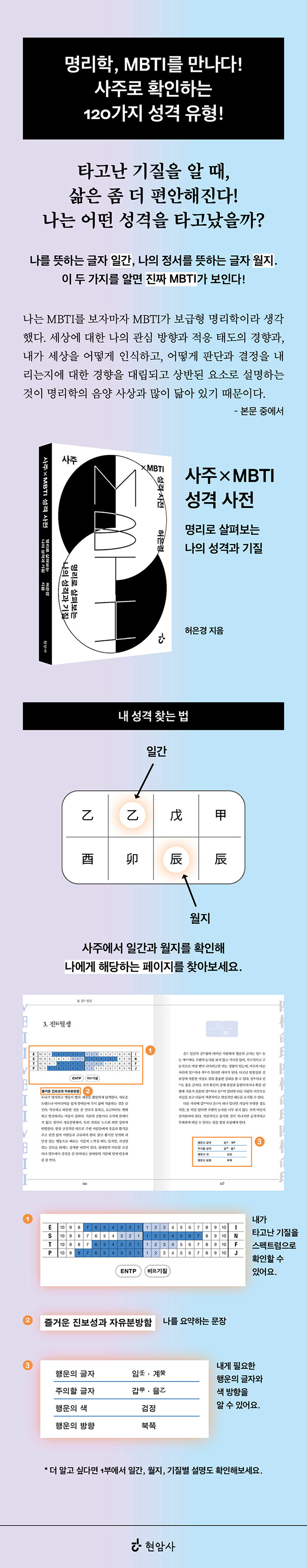 ÆÈÀÚ. »çÁÖÆÈÀÚ(ÞÌñºø¢í®)¿¡¼ À¯·¡ÇÑ ÀÌ ¸»Àº ÇÑ »ç¶÷ÀÇ Æò»ýÀÇ È帧°ú ¿î¸íÀ» ¶æÇÑ´Ù. ÇÑ »ç¶÷ÀÌ ÅÂ¾î³ ¿¬, ¿ù, ÀÏ, ½Ã¸¦ ¿©´ü ±ÛÀڷΠǥÇöÇØ¼ ÆÈÀÚ, µÎ ÀÚ¾¿ ¹¾î ³× ±âµÕÀ¸·Î ½á¼ »çÁÖ¶ó°í ÇÑ´Ù. »çÁÖÆÈÀÚ´Â ±× ½Ã°£ÀÇ ÇÏ´ÃÀÌ ¾î¶² ¸ð¾çÀ̾ú´ÂÁö¸¦ ¾Ë·ÁÁִµ¥, ÀÌ ÇÏ´ÃÀÇ ¸ð¾ç°ú ¿òÁ÷ÀÓÀ» ÅëÇØ Àΰ£ÀÇ ¿î¸íÀ» »ìÆìº¸´Â Çй®ÀÌ ¹Ù·Î ¸í¸®ÇÐÀÌ´Ù. ¡º»çÁÖ¡¿MBTI ¼º°Ý »çÀü¡»Àº ¸í¸®Çп¡¼ ¸»Çϴ Ÿ°í³ ¼º°ÝÀ» Ä£¼÷ÇÑ MBTIÀÇ ¾ð¾î·Î Ç®¾î³½ Ã¥ÀÌ´Ù. ¸í¸®Çп¡ µû¸£¸é ³ª¸¦ ¶æÇÏ´Â ±ÛÀÚ Àϰ£°ú ³ªÀÇ Á¤¼¸¦ ¶æÇÏ´Â ±ÛÀÚ ¿ùÁö·Î ÀÚ½ÅÀÇ ±âÁúÀ» ¾Ë ¼ö Àִµ¥, ÀÌ ±âÁúÀº ¿ÜÇâÇü(E)°ú ³»ÇâÇü(I), Á÷°üÇü(N)°ú °¨°¢Çü(S) °°Àº MBTI Ç׸ñÀ¸·Î ½±°Ô ¼³¸íÇÒ ¼ö ÀÖ´Ù. ÀÌ Ã¥Àº 10°³ÀÇ Ãµ°£°ú 12°³ÀÇ ÁöÁö Á¶ÇÕÀ¸·Î ¸¸µé¾îÁö´Â 120°¡Áö ¼º°Ý À¯ÇüÀ» »çÀü½ÄÀ¸·Î Á¤¸®ÇØ, ³» Ÿ°í³ ¼º°ÝÀÌ ¾î¶² MBTI ½ºÆåÆ®·³ ¾È¿¡ ÀÖ´ÂÁö ÇÑ´«¿¡ º¸¿©ÁØ´Ù. ³ª´Â ¾î¶² ½ÄÀ¸·Î ¼¼»óÀ» º¸°í ÆÇ´ÜÇÏ°í ´ëÇϵµ·Ï žÀ»±î? ³» ¿¡³ÊÁö´Â ¾î´À ¹æÇâÀ» ÇâÇÒ±î? »ç¶÷Àº ȯ°æ¿¡ µû¶ó º¯Çϱ⵵ ÇÏÁö¸¸, Ÿ°í³ ±âÁúÀº ½±°Ô º¯ÇÏÁö ¾Ê´Â´Ù. ³»°¡ ¾î¶² ¼ºÇâÀ» Ÿ°í³µ´ÂÁö¸¦ ¾È´Ù¸é, ÀÏ»óµµ ÈξÀ Æí¾ÈÇØÁø´Ù.
