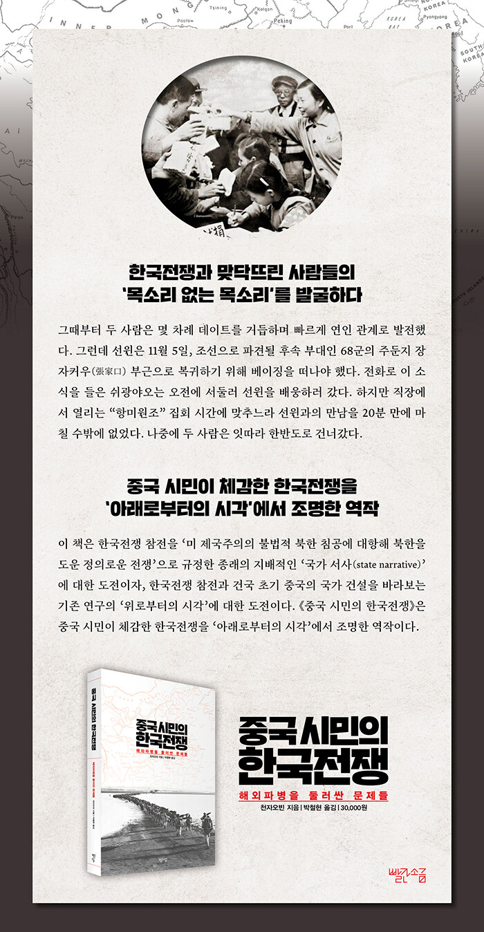 1950³â 6¿ù 25ÀÏ¿¡ ¹ß¹ßÇÑ Çѱ¹ÀüÀïÀº Çö´ë Áß±¹¿¡ Å« ¿µÇâÀ» ³¢Ä¥ ¼ö ÀÖ´Â ¡°ÁÖº¯»çÅÂ(ñ²Ü«ÞÀ÷¾)¡±¿´´Ù. ÀÌ ÀüÀï¿¡ ±º»ç·ÂÀ» ÆÄ°ßÇÒ °ÍÀΰ¡¸¦ Æ÷ÇÔÇØ ÀüÀï°ú ÆòÈ¿¡ °üÇÑ ¿©·¯ ¹®Á¦°¡ Áß±¹ »çȸ¿¡¼ ±ÞºÎ»óÇß´Ù. ¸¶¿À¼µÕÀ» Áß½ÉÀ¸·Î ÇÏ´Â ½Ã°¢¿¡¼ º¸¸é, Áß±¹ÀιÎÁö¿ø±º(ñéÏÐìÑÚÅò¤êÃÏÚ) Á¦1ÁøÀÌ ¾Ð·Ï°À» °Ç³Ê±â ½ÃÀÛÇÑ 1950³â 10¿ù 19ÀÏÀ̳ª Á¦1Â÷ Àü¿ª(îúæµ)ÀÌ ½ÃÀ۵Ǵ 10¿ù 25ÀÏÀÌ ¡°ÁÖ»çÀ§°¡ ´øÁ®Á³´Ù¡±¶ó´Â Àǹ̿¡¼ ºÐ±âÁ¡ÀÌ´Ù. ±×·¯³ª ´ç½Ã ÀÏ¹Ý ½Ã¹ÎµéÀº ±º»ç °³ÀÔ »ç½ÇÀ» °ð¹Ù·Î ¾Ë¾ÆÂ÷¸®Áö ¸øÇß´Ù. Ãʱ⿡´Â ±º»çÇൿÀÌ Àº¹ÐÇÏ°Ô ÀÌ·ïÁ³±â ¶§¹®ÀÌ´Ù. Áß±¹ ½Ã¹ÎµéÀº ¡°¹Ý¹Ì¿øÁ¶(ÚãÚ¸êµðÈ)¡± ¼±Àü ±â»ç°¡ ½Å¹® Áö¸éÀ» ¶°µé½âÇÏ°Ô ¸¸µé±â ½ÃÀÛÇÑ 10¿ù ÇϼøºÎÅÍ ¡°Ç׹̿øÁ¶(ù÷Ú¸êµðÈ)¡± ¿îµ¿ ÁöÁö¸¦ È£¼ÒÇÏ´Â °¢ ´çÆÄ ¸íÀÇÀÇ °øµ¿¼±¾ðÀÌ °øÇ¥µÈ 11¿ù 5ÀÏÀ» °ÅÄ¡¸é¼, Áö¿øºÎ´ëÀÇ ÂüÀü º¸µµ¿Í °¢Á¾ ¡°Ç׹̿øÁ¶¡± µ¿¿ø Áýȸ ¼Ò½ÄÀ» Á¢Çß´Ù. ±×¶§ºÎÅÍ 12¿ù ÃʱîÁö´Â ÆòÈ¿¡ ´ëÇÑ °ÇÑ ±â´ë°¡ ÀÖ¾î¼ ´ë±Ô¸ð ÆÄº´ ÂüÀüÀ» ¹Ý½Å¹ÝÀÇÇÏ´Ù°¡ Á¡Â÷ »ç½Ç·Î ¹Þ¾Æµé¿´´Ù. ÀÌ Ã¥Àº Çѱ¹ÀüÀï ¹ß¹ß ÀÌÈÄ ÇÑ ´Þ ¹ÝÀ» Áß½ÉÀ¸·Î ±× ¾ÕµÚ 8°³¿ù µ¿¾È Áß±¹ °¢Áö ½Ã¹ÎµéÀÇ ¡°¸ñ¼Ò¸® ¾ø´Â ¸ñ¼Ò¸®¡±¸¦ º¹¿øÇÏ·Á´Â ½Ãµµ´Ù. Áï, Çѱ¹ÀüÀï ¹ß¹ß ¾ÕµÚ·Î Áß±¹ÀÇ ´Ù¾çÇÑ °èÃþ¡ªÁö½ÄÀÎ, ³ëµ¿ÀÚ, ³ó¹Î, »ó°ø¾÷ÀÚ, Çлý, À庴°ú ±× °¡Á·µé¡ªÀÌ ½ÇÁ¦·Î ¾î¶² °øÆ÷¿Í ±â´ë, ¹Ý´ë¿Í ÁöÁö, È¥¶õ°ú ÈÇØÀÇ °¨Á¤À» °æÇèÇß´ÂÁö¸¦ ´ÙÃþÀûÀ¸·Î º¹¿øÇÑ´Ù. ƯÈ÷ ±âÁ¸ ¡°¸¶¿À¼µÕÀÇ Çѱ¹ÀüÀÀ̶ó´Â °üÁ¡¿¡¼ÀÇ ¿¬±¸°¡ °ÅÀÇ ´Ù·çÁö ¾Ê¾Ò´ø ½Ã¹ÎµéÀÇ °æÁ¦Àû ºÒ¾È, ¿øÀÚÆøÅº °øÆ÷, ÀüÀï ȸÇÇ ½É¸®, µ¿¸Í¿¡ ´ëÇÑ ÀDZ¸½É °°Àº »ý»ýÇÑ ¸ñ¼Ò¸®¸¦ ¹ß±¼ÇÑ´Ù.