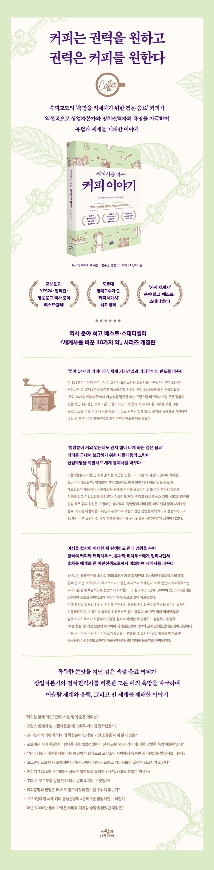 Ä¿ÇÇ´Â ¾î¶»°Ô ¼¼°è»ç¸¦ ¹Ù²åÀ»±î? ¡º¼¼°è»ç¸¦ ¹Ù²Û Ä¿ÇÇ À̾߱⡻´Â ¡®¡®Ä¿ÇÇ´Â ¿ø·¡ ¿ÍÀÎÀ̾ú´Ù¡¯¶ó´Â ¸»ÀÇ ¼ûÀº Àǹ̴Â?¡¯, ¡®Ä¿Çǰ¡ ¡®´Ï±×·ÎÀÇ ¶¡¡¯À̶ó´Â ¼¶¶àÇÑ º°¸íÀ¸·Î ºÒ¸®°Ô µÈ Àº¹ÐÇÏ°íµµ ÀÜȤÇÑ ÀÌÀ¯´Â?¡¯, ¡®Ä¿Çǹ®¸í°ú ÀüÀïÀº ¿Ö ¼·Î ºÒ±¸´ëõÀÇ ¿ø¼öÀÏ ¼ö¹Û¿¡ ¾ø´Â°¡?¡¯ µî Ä¿ÇǸ¦ µÑ·¯½Ñ ±Ù¿øÀû Àǹ®À» ´øÁö°í ±×¿¡ ´ëÇØ ³¯Ä«·Ó°Ô ÅëÂûÇÑ´Ù. ¶ÇÇÑ ÀÌ Ã¥Àº ¡®Ä¿ÇÇ¿Í Ä«Æä°¡ ¾ø¾ú´Ù¸é ÇÁ¶û½º °è¸ùÁÖÀÇ ¿îµ¿µµ ÇÁ¶û½º´ëÇõ¸íµµ ÀϾÁö ¾Ê¾ÒÀ» °ÍÀÌ´Ù?!¡¯, ¡®¼¼°è»çÀÇ È帧À» ¹Ù²Û µ¶ÀÏÇõ¸íÀÇ Æ®¸®°Å¸¦ ´ç±ä °ÍÀÌ Ä¿ÇÇ¿´´Ù´Âµ¥?¡¯, ¡®ÇÁ¸®µå¸®È÷ ´ë¿ÕÀÌ ÀÇ»çµé¿¡°Ô ¸í·ÉÇØ ¡®Ä¿ÇÇ¿¡ µ¶¼ººÐÀÌ ÀÖ´Ù¡¯´Â °ÅÁþ ¼Ò¹®À» ³»°Ô ÇÑ ±î´ßÀº?¡¯, ¡®ÇÁ·ÎÀ̼¾ ½Ã´ë µ¶ÀÏÀÎÀÌ ¹Ý³ªÆú·¹¿Ë ÇØ¹æÀüÀï¿¡ ³ª¼± ÀÌÀ¯´Â ¡®ÁøÂ¥ Ä¿ÇÇ¡¯¿¡ ´ëÇÑ °·ÄÇÑ ¿å¸Á ¶§¹®À̾ú´Ù?¡¯ µî À̽½¶÷ ¼öÇDZ³µµ°¡ ¿å¸ÁÀ» ¾ïÁ¦Çϱâ À§ÇÑ µµ±¸·Î ¸¶½Ã´ø ¡®°ËÀº À½·á¡¯°¡ ¿ª¼³ÀûÀ¸·Î »ó¾÷ÀÚº»°¡¿Í Á¤Ä¡±Ç·ÂÀÚÀÇ ¡®°ËÀº ¿å¸Á¡¯À» ÀÚ±ØÇÏ¸ç ¾Æ¶óºñ¾Æ¿Í À¯·´, ³ª¾Æ°¡ Àü ¼¼°è¸¦ Á¦ÆÐÇÑ Èï¹Ì·Ó°íµµ ¸ÅȤÀûÀÎ À̾߱⸦ ´Ù·é´Ù.