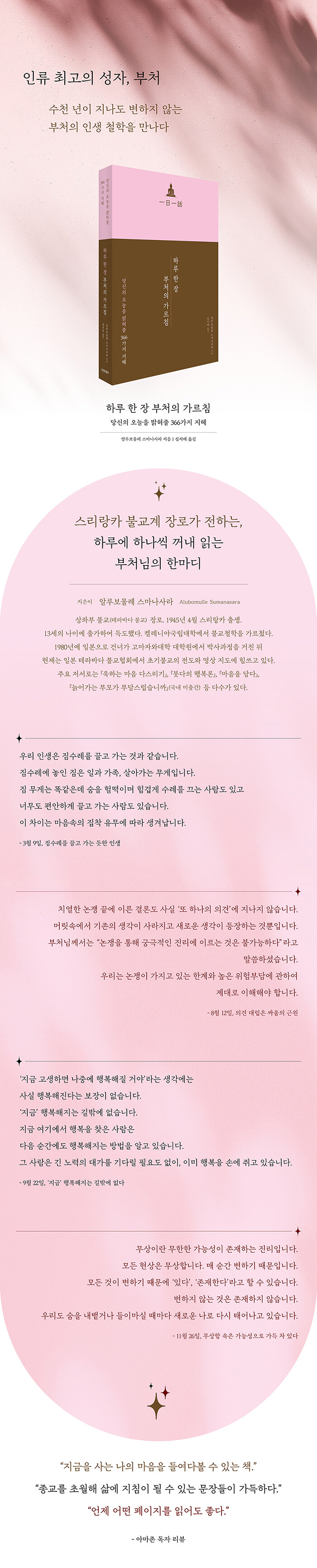¡ºÇÏ·ç ÇÑ Àå ºÎóÀÇ °¡¸£Ä§¡»Àº ¡º¹ý±¸°æ¡», ¡º±æ»ó°æ¡», ¡º¾Æ³ªÀ²°æ¡», ¡º»è°¨°æ¡», ¡ºÀÚºñ°æ¡» µî ºÒ±³ °æÀü¿¡¼ ¹ßÃéÇÑ ºÎóÀÇ °¡¸£Ä§À» ½º¸®¶ûÄ« ºÒ±³°èÀÇ Àå·ÎÀÎ ÀúÀÚ°¡ Çö´ëÀεéÀÇ ´«³ôÀÌ¿¡ ¸Â°Ô ´Ùµë¾î ÀüÇÑ Ã¥ÀÌ´Ù. ¡®º´Àº ±âȸ´Ù¡¯, ¡®»ý°¢ÇÏÁö ¾Ê´Â »ç¶÷ÀÌ ÁöÇý·Î¿î »ç¶÷ÀÌ´Ù¡¯, ¡®Áö±Ý ÀÌ ¼ø°£¿¡ ÁýÁßÇ϶ó¡¯, ¡®¼ø°£ÀÇ ÀÛÀº ÇàÀ§¸¦ ±ÍÇÏ°Ô ¿©±âÀÚ¡¯ µî Àϻ󿡼 ½±°Ô Àû¿ëÇÒ ¼ö ÀÖ´Â ºÎóÀÇ Ã¶ÇÐÀ» ÇÏ·ç¿¡ ÇÑ ÆäÀÌÁö¾¿ ¼³ÆÄÇÑ´Ù. ÀÏ ³â ¿µÎ ´Þ, ÃÑ 366ÀϺÐÀÇ ÂªÀº À̾߱⸦ ¼ö·ÏÇØ ÇÏ·ç¿¡ ÇÑ À̾߱⾿ ±íÀÌ À½¹ÌÇÒ ¼ö ÀÖµµ·Ï ±¸¼ºÇß´Ù. ¸ÅÀÏ ÀϾ´Â ¹®Á¦¿¡ ÀÏÀÏÀÌ °í¹ÎÇϰųª ¿ì¿ïÇØÇÏÁö ¾Ê°í, ¡®Áö±ÝÀÇ ³ª¡¯¿¡°Ô ÁýÁßÇÏ¸ç ¼ø°£¼ø°£ÀÇ ÇູÀ» ãÀÚ´Â °ÍÀÌ ºÎóÀÇ ÁÖµÈ °¡¸£Ä§ÀÌ´Ù.