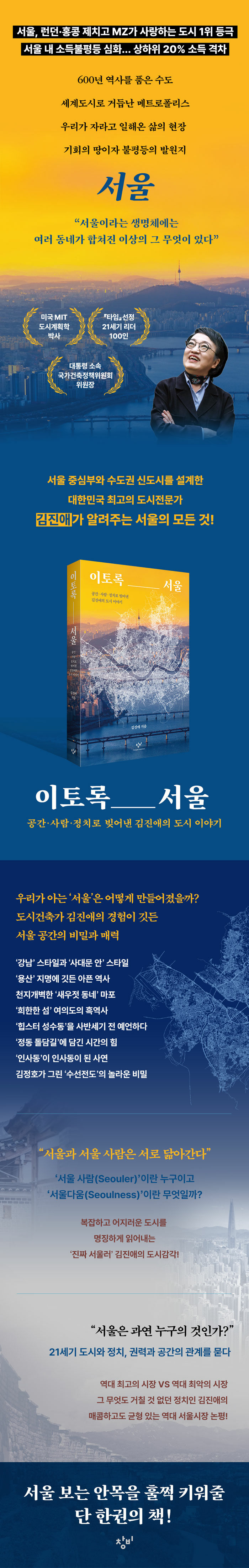 °ÇÃà°ú Á¤Ä¡¸¦ ¾Æ¿ì¸£´Â µ¶º¸ÀûÀÎ µµ½ÃÀü¹®°¡ÀÌÀÚ ´ëÅë·É ¼Ò¼Ó ±¹°¡°ÇÃàÁ¤Ã¥À§¿øÈ¸ À§¿øÀåÀÎ ±èÁø¾Ö°¡ ¡®¼¿ïÀ̶ó´Â »ý¸íü¡¯¸¦ ÀÔüÀûÀ¸·Î ±×·Á³½ Ã¥ ¡ºÀÌÅä·Ï ¼¿ï¡»ÀÌ Ãâ°£µÇ¾ú´Ù. ¼¼»ì ±â¾ïÀÇ Ã¹ ¼ø°£ºÎÅÍ ¼¿ï°ú ÇÔ²² ÀÚ¶ó°í ÀÏÇØ¿Â ¡®¼¿ï·¯¡¯ÀÌÀÚ Àλ絿±æ°ú »êº» ½Åµµ½Ã¸¦ ¼³°èÇÑ µµ½Ã°ÇÃà°¡·Î¼ °ø°£¡¤»ç¶÷¡¤Á¤Ä¡¶ó´Â ¼¼°¡Áö Ű¿öµå¸¦ ÅëÇØ ¼¿ïÀ» À̾߱âÇÑ´Ù. ¿ì¸®°¡ »ç¶ûÇÏ´Â ¼¿ïÀÇ µ¿³×¿Í °ø°£Àº ¾ðÁ¦ ¾î¶»°Ô Áö±ÝÀÇ ¸ð½ÀÀÌ µÇ¾ú´ÂÁö, À̰÷¿¡ »ì¾Æ°¡´Â ¡®¼¿ï »ç¶÷¡¯À̶õ ´©±¸ÀÌ°í ¡®¼¿ï´Ù¿ò¡¯À̶õ ¹«¾ùÀÎÁö, ¼¿ïÀÌ ´ã¾Æ³½ Á¤Ä¡ ¿ªÇÐÀº ¾î¶² °ø°£À» ºú¾î³»´ÂÁö µµ½Ã¿Í Á¤Ä¡¸¦ ³Ñ³ªµå´Â Àü¹®°¡·Î¼ ±èÁø¾Ö¸¸ÀÌ ÀüÇÒ ¼ö ÀÖ´Â ¼¿ïÀÇ Èï¹Ì·Î¿î »ç¿¬À» ½Ã¿ø½º·¹ Ç®¾î³½´Ù. ¼¿ï °÷°÷¿¡ ¼û°ÜÁø ¸Å·Â°ú ºñ¹ÐºÎÅÍ ¼¿ï »ç¶÷°ú ¼¿ï´Ù¿ò¿¡ ´ëÇÑ ¸íÄèÇÑ ÇØ¼³, ¿ª´ë ¼¿ï½ÃÀåµéÀ» ÇâÇÑ ³¯Ä«·Î¿î ³íÆò±îÁö ¼¿ïÀ̶ó´Â µµ½Ã¿¡ °üÇØ ÀÌÅä·Ï ¾ËÂ÷°í dz¼ºÇÑ ÅØ½ºÆ®´Â Áö±Ý±îÁö ¾ø¾ú´Ù. ¡ºÀÌÅä·Ï ¼¿ï¡»À» ÀÐ°í ³ª¸é ¼¿ïÀ» º¸´Â ¾È¸ñÀÌ Èǽ ³Ð¾îÁö¸ç ÀÌ ½Ã´ëÀÇ ¡®¼¿ï·¯¡¯·Î ´Ù½Ã ž °ÍÀÌ´Ù.
