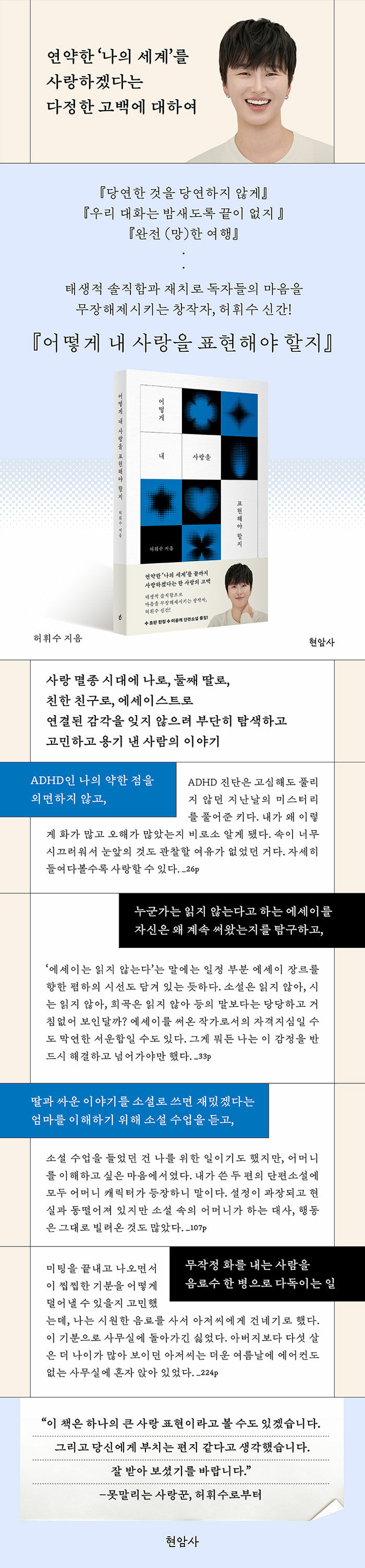 À¯Æ©ºê ä³Î ¡´±èÀºÇÏ¿Í ÇãÈÖ¼ö¡µ·Î ±¸µ¶ÀÚ 23.6¸¸ ¸íÀÇ ¿·ÄÇÑ ÀÀ¿øÀ» ¹ÞÀ¸¸ç Ȱ¹ßÈ÷ Ȱµ¿ ÁßÀΠâÀÛÀÚ ÇãÈÖ¼ö, ±×°¡ ½ÅÀÛ ¡º¾î¶»°Ô ³» »ç¶ûÀ» Ç¥ÇöÇØ¾ß ÇÒÁö¡»·Î µ¹¾Æ¿Ô´Ù. ÇãÈÖ¼ö´Â ù °³ÀÎ ¿¡¼¼ÀÌ ¡º´ç¿¬ÇÑ °ÍÀ» ´ç¿¬ÇÏÁö ¾Ê°Ô¡» Ãâ°£ ÀÌÈÄ ¡º¿ì¸® ´ëÈ´Â ¹ã»õµµ·Ï ³¡ÀÌ ¾øÁö¡»(°øÀú), ¡º¿ÏÀü (¸Á)ÇÑ ¿©Çà¡»(°øÀú)À» Ãâ°£Çϸç âÀÛ È°µ¿À» À̾î¿Ô´Ù. ÀÌÈÄ ¿¹¼ú, ¿©Çà, ¿ìÁ¤, ¿îµ¿ µî¿¡ °üÇÑ ÄÜÅÙÃ÷¸¦ ÅëÇØ ´Ùä·Î¿î ¶óÀÌÇÁ ½ºÅ¸ÀÏÀ» °øÀ¯ÇØ ¿Ô´Ù.