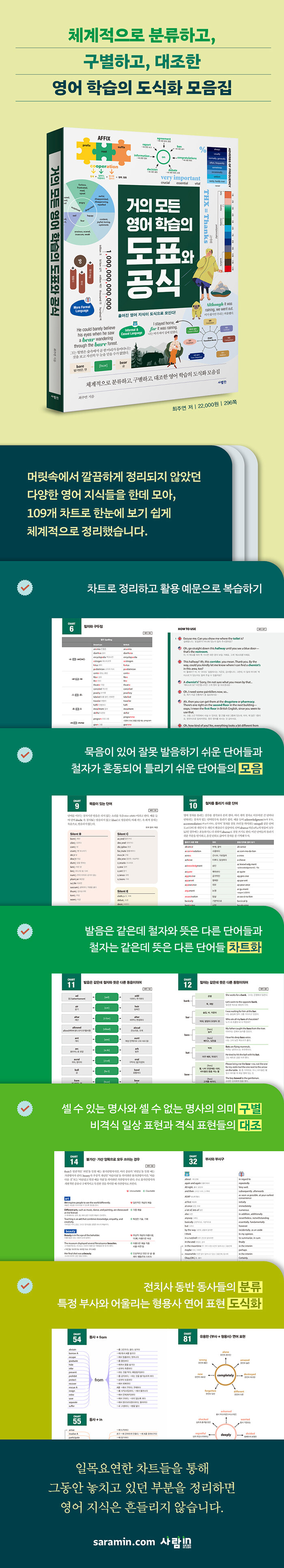 ¿µ¾î¸¦ °øºÎÇÒ ¶§¸¶´Ù ¸¶ÁÖÄ¡´Â ¿©·¯ °¡Áö Çò°¥¸®´Â ±ÔÄ¢°ú ¿¹¿ÜÀû ¿ë¹ýµé, È¥µ¿µÇ¾î Ʋ¸®±â ½¬¿î ¾îÈÖµéÀ» ¼öÁýÇØ, 109°³ÀÇ Â÷Æ®·Î ±ò²ûÇÏ°Ô Á¤¸®Çß½À´Ï´Ù. ¸Ó¸´¼Ó¿¡ »ê¹ßÀûÀ¸·Î Èð¾îÁ® ÀÖ´ø ¿µ¾î Áö½ÄµéÀ» ü°èÀûÀ¸·Î ºÐ·ùÇÏ°í ¸ñ·ÏÈÇßÀ» »Ó¸¸ ¾Æ´Ï¶ó, ¿ì¸® ¸ðµÎ°¡ °®°í ÀÖ´Â ¡®½Ã°¢ Á¤º¸ ó¸® ´É·Â¡¯À» ÀÌ¿ëÇÒ ¼ö ÀÖµµ·Ï, µµÇ¥¿Í °ø½ÄÀ¸·Î ½Ã°¢ÈÇß½À´Ï´Ù. ±º´õ´õ±â´Â °È¾î³»°í Çٽɸ¸ ÇÑ´«¿¡ ÀÌÇØÇÒ ¼ö ÀÖµµ·Ï ±¸¼ºÇØ, ÇÊ¿äÇÒ ¶§ ¹Ù·Î ã¾Æ¼ Ȱ¿ëÇÒ ¼ö ÀÖ½À´Ï´Ù.