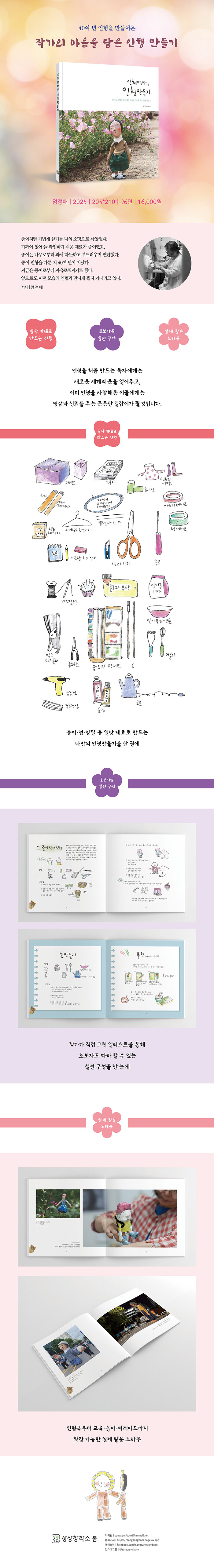 ¡ºÀÎÇü¾ö¸¶ÀÇ ÀÎÇü¸¸µé±â¡»´Â 40³â°£ ÀÎÇüÀ» ¸¸µé°í °ø¿¬ÇØ ¿Â ÀÎÇü âÀÛ°¡ ¾öÁ¤¾ÖÀÇ °æÇè°ú ±â¼ú, ±×¸®°í ÀÎÇüÀ» ÇâÇÑ ±íÀº ¾ÖÁ¤À» ÇÑ ±Ç¿¡ ´ãÀº ½ÇÀü ¾È³»¼ÀÔ´Ï´Ù. Á¾ÀÌ¡¤Ãµ¡¤¾ç¸»Ã³·³ ÀÏ»ó °¡±îÀÌ ÀÖ´Â Àç·á¸¦ ¿¹¼ú·Î È®ÀåÇϸç, ¸¸µå´Â °úÁ¤¿¡¼ ã¾Æ¿À´Â ¸ôÀÔ¡¤±â»Ý¡¤Ä¡À¯ÀÇ °¨Á¤À» µû¶æÇÑ ½Ã¼±À¸·Î º¸¿©ÁÝ´Ï´Ù. Á¾À̸·´ëÀÎÇü, °üÀýÀÎÇü, ¸¶½ºÅ©ÀÎÇü, Å«ÀÎÇü, ¼ÕÀÎÇü, ¸ðÀÚÀÎÇü, ³³ÀÛÀÎÇü, ÀÎÇü±Ø ±×¸²»óÀÚ±îÁö 8°¡Áö ÀÎÇü Á¦ÀÛ¹ýÀ» µû¶ó°¡´Ù º¸¸é, ÇÑ »ç¶÷ÀÌ ¼Õ³¡À¸·Î âÁ¶ÇÑ Á¸Àç°¡ »î°ú ¹«´ë¿¡¼ ¾î¶»°Ô °¨Á¤°ú »ó»óÀ» ²ø¾î³»´ÂÁö ÀÚ¿¬½º·¹ °æÇèÇÏ°Ô µË´Ï´Ù. ÀÎÇüÀ» óÀ½ ¸¸µå´Â µ¶ÀÚ¿¡°Ô´Â »õ·Î¿î ¼¼°èÀÇ ¹®À» ¿¾îÁÖ°í, ÀÌ¹Ì ÀÎÇüÀ» »ç¶ûÇØ ¿Â À̵鿡°Ô´Â ¿µ°¨°ú ½Å·Ú¸¦ ÁÖ´Â µçµçÇÑ ±æÀâÀ̰¡ µÉ °ÍÀÔ´Ï´Ù.