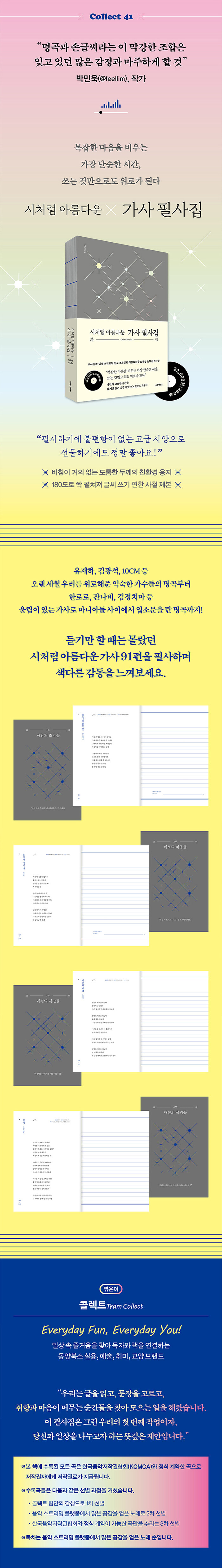 ¡°¡´½Ãó·³ ¾Æ¸§´Ù¿î °¡»ç ÇÊ»çÁý¡µ¿¡´Â ¡®ºñ¿ò¡¯ÀÌ ÇÊ¿äÇÑ ´ç½Å¿¡°Ô °Ç³×°í ½ÍÀº ³ë·¡ 91°îÀÌ ¼ö·ÏµÇ¾î ÀÖ½À´Ï´Ù. À§·Î¿Í ¾ÈºÎ, »ç¶ûÀÇ À̾߱Ⱑ ´ã±ä ³ë·¡¸¦ µè°í ÇÊ»çÇÏ¸ç ¾î´À ¼ø°£, ¹®Àå Çϳª°¡ ´ç½ÅÀÇ ¸¶À½ Çѱ¸¼®¿¡ ´ê¾Æ ¼¼»óÀ» ¹à°Ô ºñÃß±æ ¹Ù¶ø´Ï´Ù.¡± from_ team collect