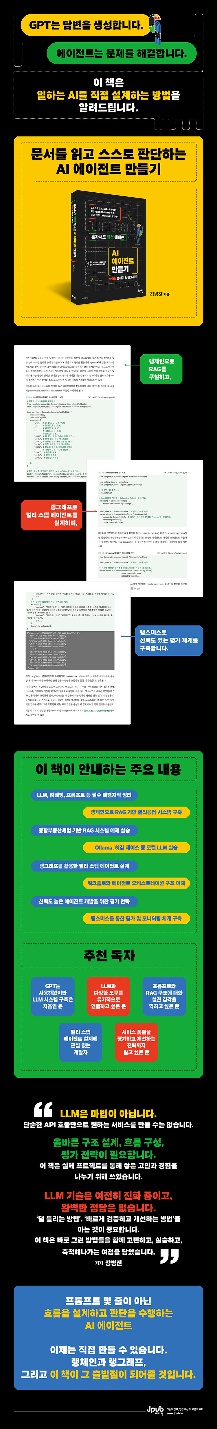 ÀÌ Ã¥Àº LangChainÀ¸·Î ¹®¼ ±â¹Ý RAG ½Ã½ºÅÛÀ», LangGraph·Î ¸ÖƼ½ºÅÜ ¿¡ÀÌÀüÆ®¸¦ ±¸ÇöÇÏ´Â °úÁ¤À» ´Ù·é´Ù. ´Ü¼øÇÑ ÄÚµå ³ª¿ÀÌ ¾Æ´Ï¶ó ¿Ö ±×·¸°Ô ¼³°èÇß´ÂÁö¸¦ ÇÔ²² ¼³¸íÇÏ¸ç ½ÇÀü °¨°¢À» ±æ·¯ÁØ´Ù. Á¾Çպε¿»ê¼¼¹ý°ú ¼Òµæ¼¼¹ý ¿¹Á¦¸¦ ÅëÇØ ½ÇÁ¦ ¹ý·É ¹®¼¸¦ ó¸®ÇÏ´Â RAG ½Ã½ºÅÛÀ» Á÷Á¢ ±¸¼ºÇغ¸¸é¼ ÇÁ·ÒÇÁÆ® Àü·«, º¤ÅÍ °Ë»ö, ¿ÜºÎ µµ±¸ ¿¬µ¿, ¿¡ÀÌÀüÆ® ¿ÀÄɽºÆ®·¹À̼Ç, Æò°¡ µîÀ» ´Ü°èº°·Î ÀÍÈù´Ù. ÀÌ Ã¥À» µ¤À» ÁîÀ½¿¡´Â ÀڽŸ¸ÀÇ ¿¡ÀÌÀüÆ® ±â¹Ý ¼ºñ½º¸¦ óÀ½ºÎÅÍ ³¡±îÁö Á÷Á¢ ¼³°èÇÏ°í ±¸ÇöÇÒ ¼ö ÀÖ°Ô µÉ °ÍÀÌ´Ù.