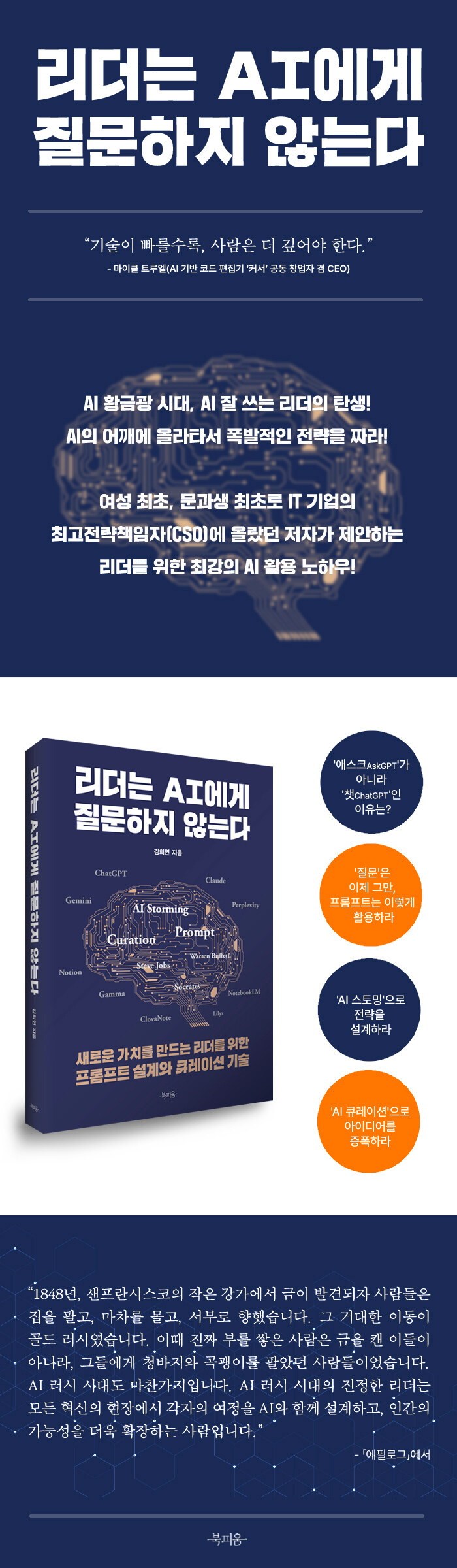 ±×·±µ¥ ¿Ö ±×µéÀº AI¸¦ »ç¿ëÇÏÁö ¾ÊÀ»±î? êGPT µîÀå ÀÌÈÄ ¡®AI¸¦ ¾î¶»°Ô Ȱ¿ëÇÒ °ÍÀΰ¡¡¯°¡ ºñÁî´Ï½º ¸®´õµéÀÇ ÇÙ½É ÈµÎ·Î ¶°¿À¸£±ä Çß´Ù. ±×·¯³ª ÃÊâ±â AI°¡ ³»³õÀº Æò±ÕÀûÀÌ°í Æò¹üÇÑ °á°ú¿¡ ½Ç¸ÁÇÏ¿© ´õ ÀÌ»ó ¾²Áö ¾ÊÀ½À¸·Î½á AIÀÇ Áø°¡¸¦ ¹ß°ßÇÏÁö ¸øÇϰí ÀÖ´Ù. ¿©¼º ÃÖÃÊÀÌÀÚ ¹®°ú»ý ÃÖÃÊ·Î IT ±â¾÷ÀÇ ÃÖ°íÀü·«Ã¥ÀÓÀÚ(CSO)¿¡ ¿Ã¶ú´ø ÁöÀºÀÌ´Â Á¶Á÷ÀÇ ¸®´õ°¡ AIÀÇ ÈûÀ» µî¿¡ ¾÷À¸¸é ±×¾ß¸»·Î ¡®°ÅÀÎÀÇ ¾î±ú¿¡ ¿Ã¶óꡝ Æø¹ß·ÂÀ» °¡Áú ¼ö ÀÖÀ½À» ²ç¶Õ¾îº¸¾Ò´Ù. ±×¸®°í Áö³ ¸î ³â °£ÀÇ AI ޱ¸¿Í Ȱ¿ë °æÇèÀ» Åä´ë·Î ¡º¸®´õ´Â AI¿¡°Ô Áú¹®ÇÏÁö ¾Ê´Â´Ù¡»¸¦ ½è´Ù. ÇöÀå °æÇè¿¡ Åä´ëÇÏ¿© AI¿Í Ä£ÇØÁö´Â ±âº» ´Ü°èºÎÅÍ Àü·«Àû µ¿·á·Î Ȱ¿ëÇÏ´Â °í±Þ ·¹º§±îÁö, Á¶Á÷ÀÇ ¸®´õµéÀÌ ÀÌÇØÇϱ⠽±°í È¿À²ÀûÀ¸·Î AIÀÇ ¿ø¸®¸¦ ÇнÀÇÏ¿© ÇöÀå¿¡ Àû¿ë½Ãų ¼ö ÀÖ´Â µ¶Ã¢ÀûÀÎ ¹æ¹ý·ÐÀ» ´ã°í ÀÖ´Ù.