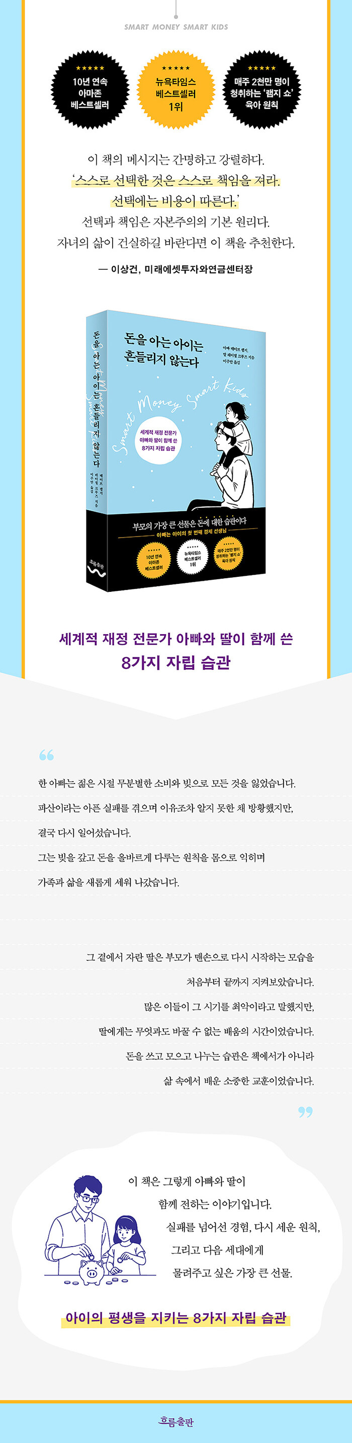 ÀÌ Ã¥Àº Ãâ°£ Á÷ÈÄ ´º¿åŸÀÓ½º º£½ºÆ®¼¿·¯ 1À§¿¡ ¿Ã¶úÀ¸¸ç 10³â ¿¬¼Ó ¾Æ¸¶Á¸ Àڳ౳À° ºÐ¾ß º£½ºÆ®¼¿·¯ ÀÚ¸®¸¦ ÁöŰ¸ç ¼ö¸¹Àº ºÎ¸ðµéÀÇ °ø°¨À» ¾ò¾ú´Ù. ¶ÇÇÑ ¸ÅÁÖ 2õ¸¸ ¸íÀÌ Ã»ÃëÇÏ´Â ¶óµð¿À ÇÁ·Î±×·¥ ¡¸´õ ·¥Áö ¼î¡¹¸¦ ÅëÇØ ÀÌ¹Ì °ËÁõµÈ ±³À° öÇÐÀÌ ´ã°Ü ÀÖ´Ù. ¡®³ëµ¿, ¼Òºñ, ÀúÃà, ±âºÎ, ¿¹»ê, ºÎä, ÀÚÁ·, ·¹°Å½Ã¡¯¶ó´Â 8°¡Áö ÀÚ¸³ ½À°üÀ» Áß½ÉÀ¸·Î ¾ÆÀ̰¡ ¾î¸± ¶§ºÎÅÍ µ·ÀÇ °¡Ä¡¸¦ ¹è¿ì°í ½º½º·Î Ã¥ÀÓÁö´Â ÈÆ·ÃÀ» Çϵµ·Ï µ½´Â´Ù.