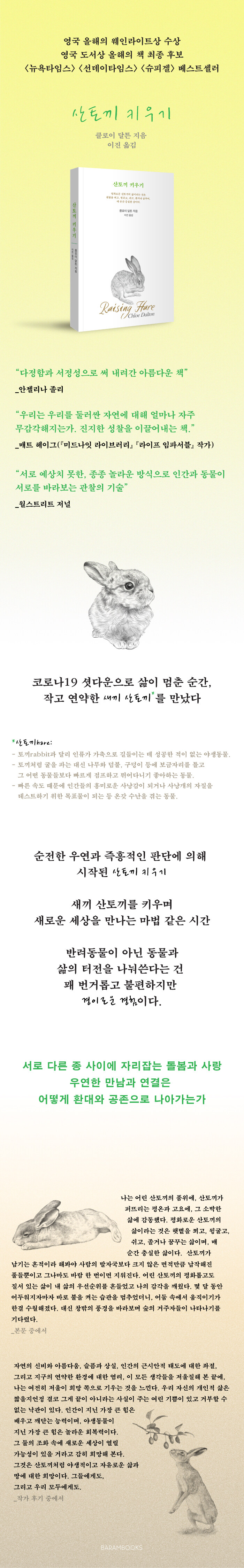 ¡º»êÅä³¢ Ű¿ì±â¡»´Â Äڷγª19 ¼Ë´Ù¿î ½Ã±â ½Ã°ñÁý¿¡ ¸Ó¹°´Ù°¡ ¿ì¿¬È÷ ¾ß»ý »êÅä³¢ »õ³¢¸¦ Ű¿ì°Ô µÈ ÀúÀÚ°¡ »õ·Î¿î ¼¼°è¿¡ ´«¶ß´Â °úÁ¤À» ´ãÀº ³íÇȼÇÀÌ´Ù. ¡®¾ß»ý¡¯ »êÅä³¢¶ó°í Ç¥ÇöÇßÁö¸¸ ¾ö¹ÐÈ÷ ¸»ÇØ »êÅä³¢hare´Â Åä³¢rabbit°ú ´Þ¸® Àηù°¡ °¡ÃàÀ¸·Î ±æµéÀÌ´Â µ¥ ¼º°øÇÑ ÀûÀÌ ¾ø´Â µ¿¹°ÀÌ´Ù. ¸»ÇÏÀÚ¸é ¸ðµç »êÅä³¢´Â ¾ß»ý »êÅä³¢´Ù. Å䳢ó·³ ±¼À» ÆÄ´Â ´ë½Å ³ª¹«¿Í ´ýºÒ, ±¸µ¢ÀÌ µî¿¡ º¸±ÝÀÚ¸®¸¦ Ʋ°í ±× ¾î¶² µ¿¹°µéº¸´Ù ºü¸£°Ô Á¡ÇÁÇÏ°í ¶Ù¾î´Ù´Ï±â ÁÁ¾ÆÇÏ´Â ½À¼ºÀ» º¸¸é ±×¾ß¸»·Î ¾ß»ý¼ºÀÌ °ÇÑ µ¿¹°À̱⵵ ÇÏ´Ù. »êÅä³¢µéÀº ºü¸¥ ¼Óµµ ¶§¹®¿¡ Àΰ£µéÀÇ Èï¹Ì·Î¿î »ç³É°¨ÀÌ µÇ°Å³ª »ç³É°³ÀÇ ÀÚÁúÀ» Å×½ºÆ®Çϱâ À§ÇÑ ¸ñÇ¥¹°ÀÌ µÇ´Â µî ¿Â°® ¼ö³À» °Þ°ï ÇÑ´Ù. ÀúÀÚ´Â »êÃ¥À» ³ª°¬´Ù°¡ ÅÂ¾î³ Áö ¾ó¸¶ µÇÁö ¾ÊÀº »êÅä³¢¸¦ ¸¸³ª°í ¿À·£ ¸Á¼³ÀÓ ³¡¿¡ ÁýÀ¸·Î µ¥·Á¿Â´Ù. ¼øÀüÇÑ ¿ì¿¬°ú ÁïÈïÀûÀÎ ÆÇ´Ü¿¡ ÀÇÇØ ½ÃÀÛµÈ »êÅä³¢ Ű¿ì±â. ÀúÀÚ´Â »õ³¢ »êÅä³¢¸¦ ¹«»çÈ÷ ¼ºÃ¼·Î ¼ºÀå½ÃÄÑ ÀÚ¿¬À¸·Î µ¹·Áº¸³»´Â °ÍÀ» ¸ñÇ¥·Î ¼¼½ÉÇϰÔ, Àΰ£ÀÇ ¹æ½ÄÀ¸·Î ±æµéÀÌÁö ¾ÊÀ¸·Á°í Á¶½ÉÇÏ¸ç »êÅä³¢¿Í ÇÔ²² Áö³»±â ½ÃÀÛÇÑ´Ù.