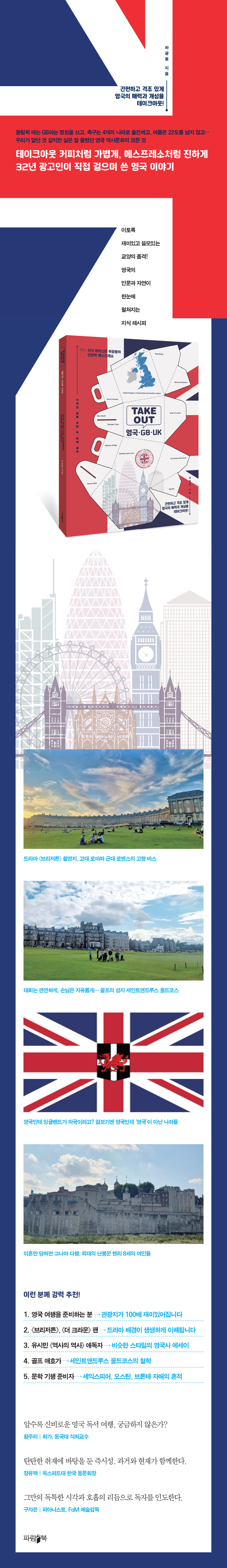 Çϱ¤¿ëÀÇ 'TAKEOUT' ½Ã¸®Áî´Â ÀÌ¹Ì ¡¶À¯·´¿¹¼ú¹®È¡·, ¡¶À¯·´¿ª»ç¹®¸í¡·, ¡¶ÀϺ»±Ù´ë¹é³â¡·À¸·Î µ¶ÀÚµéÀÇ »ç¶ûÀ» ¹Þ¾Ò´Ù. ³× ¹øÂ° Ã¥ÀÎ ¡¶¿µ±¹¿ª»ç¹®È¡·´Â ±×Áß¿¡¼µµ °¡Àå ¿©Çà ½Ç¿ë¼ºÀÌ ³ôÀº Ã¥ÀÌ´Ù. ¿µ±¹Àº Çѱ¹ÀÎÀÌ °¡Àå ¸¹ÀÌ Ã£´Â À¯·´ ¿©ÇàÁö Áß Çϳª´Ù. ÀÌ Ã¥Àº ±×µéÀÇ ¿©Çà °¡¹æ¿¡ ²À µé¾î°¡¾ß ÇÒ ÇʼöǰÀÌ µÉ °ÍÀÌ´Ù. Å×ÀÌÅ©¾Æ¿ô Ä¿ÇÇ ÇÑ ÀÜ °ªÀ¸·Î ¿µ±¹ õ ³âÀ» »ê´Ù. À̺¸´Ù °¡¼ººñ ÁÁÀº ÅõÀÚ°¡ ¶Ç ÀÖÀ»±î? °ü±¤Áö¸¦ 100¹è Áñ°Ì°Ô ¸¸µå´Â ÀÌ Ã¥°ú ÇÔ²² ¿µ±¹À¸·Î ¶°³ªº¸ÀÚ.