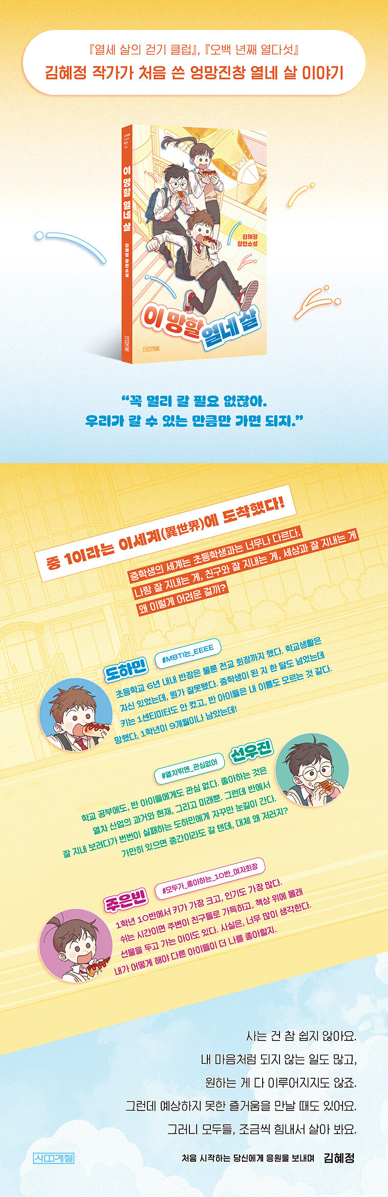 ±äÀå ¹Ý ¼³·½ ¹ÝÀ¸·Î »õ Çб³, »õ ÇгâÀ» ÁغñÇϴ û¼Ò³â¿¡°Ô ²À ¸Â´Â û¼Ò³â¼Ò¼³ÀÌ Ãâ°£µÈ´Ù. ¡º¿¼¼ »ìÀÇ °È±â Ŭ·´¡», ¡º¿À¹é ³â° ¿´Ù¼¸¡» µî À帣¸¦ ³Ñ³ªµé¸ç ½Ê ´ë µ¶ÀÚµéÀÌ »ç¶ûÇÏ´Â ÀÛǰµéÀ» ¹ßÇ¥ÇØ ¿Â ±èÇýÁ¤ ÀÛ°¡ÀÇ ½ÅÀÛ ¡ºÀÌ ¸ÁÇÒ ¿³× »ì¡»ÀÌ´Ù. ÀÌ Ã¥Àº ¼¸¥ ±Çµµ ³Ñ´Â û¼Ò³â¼Ò¼³À» ¹ßÇ¥ÇØ ¿Â ±èÇýÁ¤ ÀÛ°¡°¡ óÀ½ ¾´ ¿³× »ìµéÀÇ À̾߱â´Ù. µåµð¾î ¡®¾î¸°ÀÌ¡¯¸¦ Á¹¾÷ÇßÁö¸¸, ¡®Ã»¼Ò³â¡¯À̶ó´Â ¸»Àº ¸¶Ä¡ ù ±³º¹Ã³·³ ¾ÆÁ÷ ¾î»öÇÑ ¿³× »ìµé¿¡°Ô ÁßÇб³¶ó´Â »õ·Î¿î °ü¹®Àº ¾î¶² ÀǹÌÀϱî?
