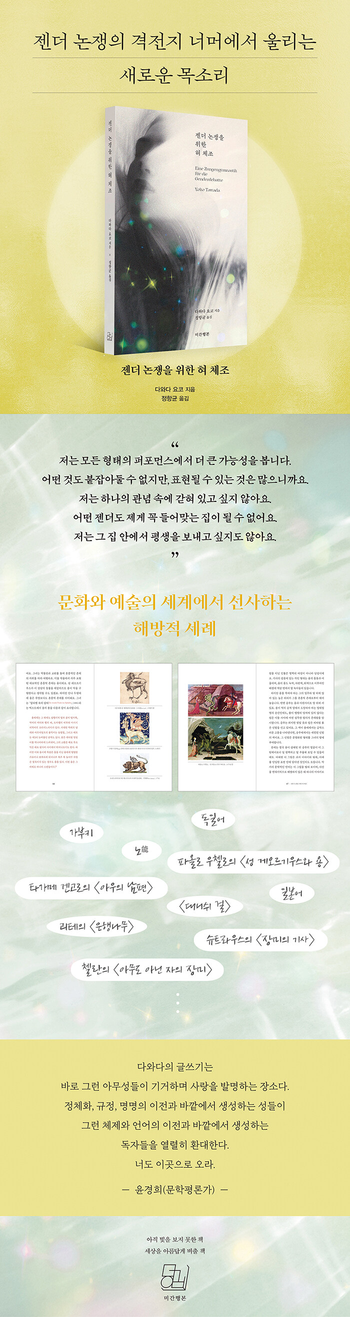 ¿À´Ã³¯ ¹ÝÁ¨´õ À̵¥¿Ã·Î±âÀÇ ºÒ¾¾°¡ À§ÇùÀûÀ¸·Î ¹øÁö°í ÀÖ´Â ÇÑÆí, ´Ù¾ç¼ºÀ» ÁöÇâÇÏ´Â Á¨´õ ¿îµ¿ÀÌ ¿©·¯ ÇöÀå¿¡¼ Ȱ¹ßÈ÷ Àü°³µÇ°í ÀÖ´Ù. ´Ù¿Í´Ù´Â ´Þ¾Æ¿À¸£´Â Á¨´õ ³íÀïÀÇ Àü¼±¿¡¼ ¹þ¾î³ª µ¶Ã¢ÀûÀÎ ½ÃÇÐÀ» ¼±º¸ÀÌ¸ç »õ·Î¿î ÁøÁö¸¦ ±¸ÃàÇÑ´Ù. ³²¼ºµµ ¿©¼ºµµ ¾Æ´Ñ, ±×µµ ±×³àµµ ¾Æ´Ñ, Æ®·£½ºµµ ÀÎÅͼ½½ºµµ ¾Æ´Ñ, ¸í¸í°ú ±ÔÁ¤°ú Á¤Ã¼È·ÎºÎÅÍ ÇØ¹æµÈ Á¸Àç°¡ À̰÷¿¡ ÀÖ´Ù. ¡ºÁ¨´õ ³íÀïÀ» À§ÇÑ Çô üÁ¶¡»´Â ´Ù¿Í´ÙÀÇ ÀÛǰ ¼¼°è¸¦ °ü·ùÇÏ´Â Á¨´õ ÀǽÄÀÌ ÀÀÃàµÈ ¸ñ¼Ò¸®ÀÌÀÚ, ²÷ÀÓ¾øÀÌ º¯ÈÇÏ´Â Á¨´õ Á¤Ã¼¼ºµéÀÇ ¸¸½ÅÀüÀÌ´Ù.