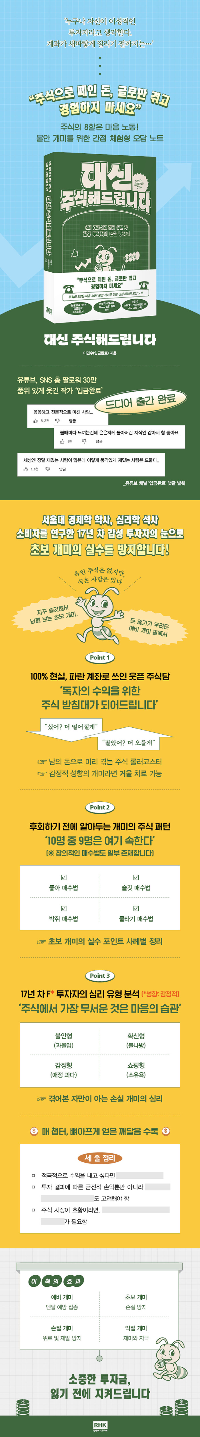 ÀÌ Ã¥Àº ¾öû³ ¼öÀÍÀ» ¾à¼ÓÇÏÁö ¾Ê´Â´Ù. ½ÇÆÐ´ãÀ¸·Î ¹è¿ì´Â ÁÖ½Ä, ³²ÀÇ µ·À¸·Î °Þ´Â ¼Õ½ÇÀ» ÅëÇØ µ¶ÀÚÀÇ ¸àÅ»À» ´Ü´ÜÈ÷ ºÙÀâ´Â ¿¹¹æ Á¢Á¾¿¡ °¡±õ´Ù. ÀÚÄ©ÇÏ¸é ¼ø½Ä°£¿¡ µ·À» ÀÒ°í, ¸¶À½°í»ýÀº ´ýÀÎ ÁÖ½Ä ÅõÀÚ¸¦ ½ÃÀÛÇÑ´Ù¸é ±× ÀÌÀ¯´Â ¿ù±Þ¸¸À¸·Î ÆÅÆÅÇÑ ¼¼»ó¿¡ °³ÀÎÀÌ °¡Áú ¼ö ÀÖ´Â ÀÚº»ÁÖÀÇÀÇ ¹«±â¸¦ Àß È°¿ëÇÏ°í ½Í¾î¼ÀÏ °ÍÀÌ´Ù. °£Á¢ °æÇèÀ» ÅëÇØ ¹«±â¸¦ ¹Ì¸® ÆÄ¾ÇÇØ µÐ´Ù¸é, óÀ½ Àâ¾Æº¸´Â ¹«±â¶óµµ ±Ý¼¼ Çö¸íÇÏ°Ô »ç¿ëÇÒ ¼ö ÀÖÁö ¾ÊÀ»±î? ¡¶´ë½Å ÁÖ½ÄÇØµå¸³´Ï´Ù¡·´Â ±×·± µ¶ÀÚµéÀ» À§ÇÑ ÁÖ½Ä ¹Þħ´ë°¡ µÇ°íÀÚ ÇÑ´Ù. ¶ó¸é ¹Þħ´ëº¸´Ù À¯¿ëÇÑ ÁÖ½Ä ¹Þħ´ë°¡ µÉ Ã¥À¸·Î¼, ¶ß°Å¿î »ó½ÂÀ庸´Ù ´õ ¿¶í »ó½Â ±×·¡ÇÁ¿Í ¸¸³¯ ¸ÚÁø µ¶ÀÚ °³¹ÌÀÇ ¹Ì·¡¸¦ ±â´ëÇØ º»´Ù.