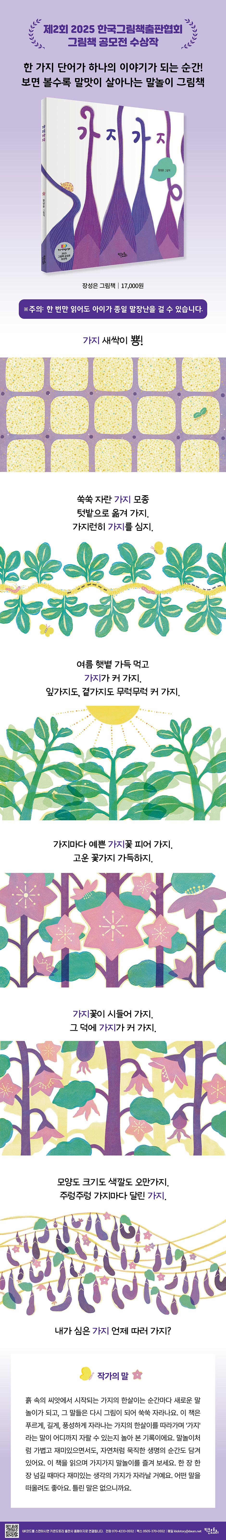 ¡¶°¡Áö°¡Áö¡·´Â Ãâ°£ ÀüºÎÅÍ ±× ÀÛǰ¼ºÀ» ³Î¸® ÀÎÁ¤¹ÞÀº ±â´ëÀÛÀÔ´Ï´Ù. Çѱ¹±×¸²Ã¥ÃâÆÇÇùȸ ÁÖ°ü ¡®Á¦2ȸ ½ÅÀÎÀÛ°¡ ±×¸²Ã¥ °ø¸ðÀü¡¯¿¡¼ ÆÄÁÖÃâÆÇµµ½Ã ¹®ÈÀç´Ü ÀÌ»çÀå»óÀ» ¼ö»óÇÏ´Â Äè°Å¸¦ ÀÌ·ç¾ú½À´Ï´Ù. ¶ÇÇÑ, 2025³â Áß¼ÒÃâÆÇ»ç µµ¾àºÎ¹® Á¦ÀÛÁö¿ø »ç¾÷¿¡ ¼±Á¤µÇ¾î ±âȹ·Â°ú ¿Ï¼ºµµ ¸é¿¡¼ ³ôÀº Æò°¡¸¦ ¹Þ¾Ò½À´Ï´Ù. ÀÛ°¡´Â Àϻ󿡼 ÈçÈ÷ Á¢ÇÒ ¼ö ÀÖ´Â ¡®°¡Áö¡¯¶ó´Â ¼ÒÀ縦 ½Å¼±ÇÑ ¹ß»ó°ú °¨°¢ÀûÀÎ ¿¬Ãâ, ¼¼·ÃµÈ »ö°¨À¸·Î ÀçÇØ¼®Çß½À´Ï´Ù. ¶ÇÇÑ, À̾߱⸦ ÀÌÇØÇϱâ À§ÇØ ¹®ÀåÀ» ¡®Çؼ®¡¯Çϱ⺸´Ù ¡®´À³¢°í Áñ±âµµ·Ï¡¯ ±¸¼ºÇØ ±×¸²Ã¥ÀÌ °¡Áø º»¿¬ÀÇ ÈûÀ» Àß º¸¿© ÁÝ´Ï´Ù. Àд Áñ°Å¿ò°ú ¹è¿ì´Â ±â»ÝÀÌ ÀÚ¿¬½º·´°Ô ¸Â´ê¾Æ ÀÖ´Â, ¡®¶±ÀÙºÎÅÍ ´Ù¸¥¡¯ ±×¸²Ã¥ ¡¶°¡Áö°¡Áö¡·ÀÇ ¼¼°è·Î ¾î¸°À̵éÀ» ÃÊ´ëÇÕ´Ï´Ù!