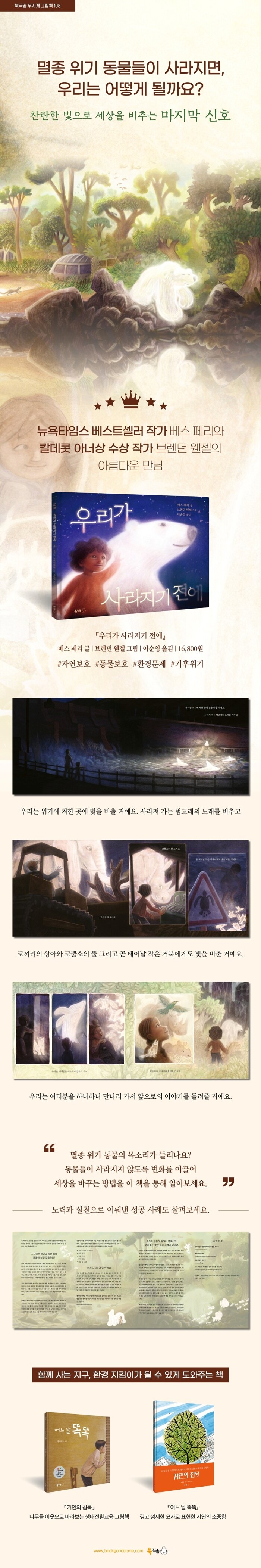 ¡º¿ì¸®°¡ »ç¶óÁö±â Àü¿¡¡»´Â º£½º Æä¸®ÀÇ ¼Á¤ÀûÀÌ°í ½ÃÀûÀÎ ¹®Ã¼¿Í ºê·»´ø À¢Á©ÀÇ ºû³ª´Â ±×¸²À¸·Î ÀüÇÏ´Â ¾Æ¸§´Ù¿î ȯ°æ ±×¸²Ã¥ÀÔ´Ï´Ù. ÀÌ À̾߱â´Â ½¯ °÷À» ã¾Æ Çì¸Å´Â ºÏ±Ø°õÀÇ »çÁø ÇÑ Àå¿¡¼ ½ÃÀ۵Ǿú½À´Ï´Ù. º£½º Æä¸®´Â ±âÈÄ º¯È·Î ºùÇϰ¡ ³ìÀ¸¸é¼ ºÏ±Ø°õÀÌ Ã³ÇÑ À§±â¸¦ ¾Ë¸®´Â ±â»ç¸¦ Á¢ÇÏ°í ºÏ±Ø°õÀÇ À§±â´Â ±×¾ß¸»·Î ºù»êÀÇ Àϰ¢À̶ó´Â »ç½ÇÀ» ¾Ë¾ÆÂ÷¸³´Ï´Ù. ¸êÁ¾ À§±âÁ¾À» »ì¸®±â À§Çؼ´Â ¹Ýµå½Ã ¹Ì·¡¸¦ ¹Ù²ã¾ß ÇÑ´Ù´Â °ÍÀ» ±ú´Ý°Ô µÇÁö¿ä. º£½º Æä¸®ÀÇ ±ÛÀº Ä®µ¥Äà ¾Æ³Ê»óÀ» ¹ÞÀº ºê·»´ø À¢Á©ÀÇ È¯»óÀûÀÎ ±×¸²°ú ¸¸³ª ºûÀ» ¹ßÇÕ´Ï´Ù. Æò¼Ò ¾ß»ý°ú ¸êÁ¾ À§±â µ¿¹°ÀÇ º¸È£¸¦ À§ÇØ ¿©·¯ ´Üü¿Í ÀÏÇϰí ÀÖ´Â ºê·»´ø À¢Á©Àº º¯È°¡ ÇÊ¿äÇÑ ¸ðµç °÷À» ¾Æ¸§´ä°íµµ Âù¶õÇÑ ºûÀ¸·Î Ç¥ÇöÇØ ³À´Ï´Ù. ´º¿åŸÀÓ½º°¡ ¼±Á¤ÇÑ º£½ºÆ®¼¿·¯ ÀÛ°¡µéÀÇ ÀÇ¹Ì ÀÖ´Â ¸¸³²À» ÅëÇØ ÁøÇÑ °¨µ¿°ú ¿©¿îÀ» ´À²¸º¸¼¼¿ä.