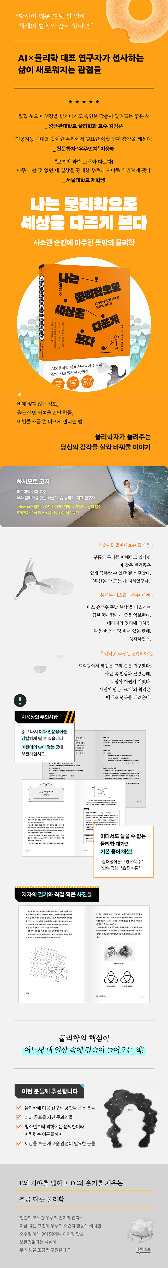 ¡¶³ª´Â ¹°¸®ÇÐÀ¸·Î ¼¼»óÀ» ´Ù¸£°Ô º»´Ù¡·´Â Æò¹üÇÑ ÀÏ»óÀ» ¹°¸®ÇÐÀÇ µµ¸¶ À§¿¡ ¿Ã·Á³õ°í Áö±Ý²¯ º¸Áö ¸øÇÑ °¢µµ·Î µÚÁý¾îº¸´Â Ã¥ÀÌ´Ù. AI¿Í ¹°¸®ÇÐÀ» ÀÕ´Â ÃÖ÷´Ü ¡®ÇнÀ ¹°¸®ÇС¯ÀÇ ´ëÇ¥ ¿¬±¸ÀÚÀÎ ÀúÀÚ°¡ ¾ÆÄ§½Ä»ç, ¿À´ÃÀÇ ³¯¾¾, ÃâÅð±Ù±æ °°Àº ¿ì¸® °çÀÇ ¼ø°£µéÀ» ¿ìÁÖÀû °üÁ¡¿¡¼ Èï¹Ì·Ó°Ô ÆîÃij»¸ç, ¹°¸®ÇÐÀÇ ±âº» °³³äÀ» ÀÚ¿¬½º·¹ ¸Ó¸´¼Ó¿¡ ³²±ä´Ù.