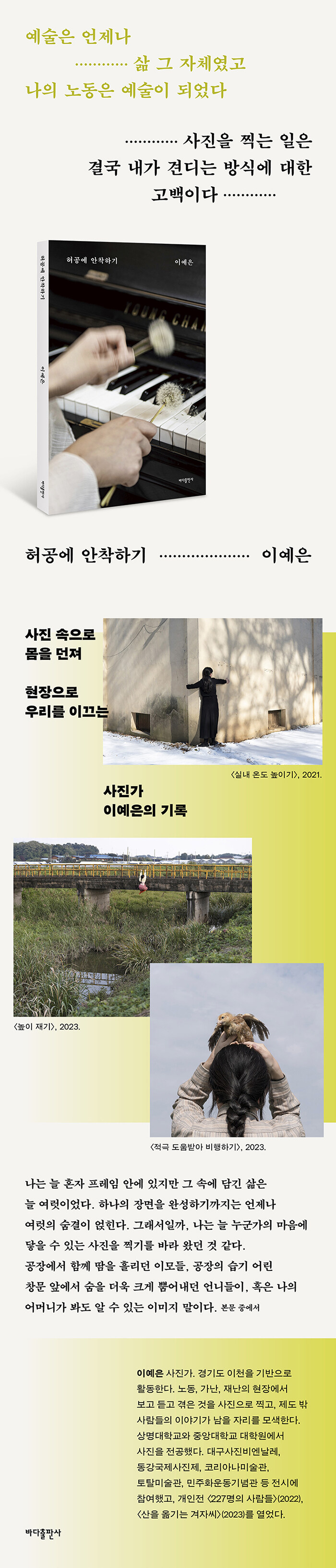 ¹Îµé·¹·Î ÇÇ¾Æ³ë ¿¬ÁÖÇϱâ, Ƽ¹éÀ¸·Î ¹Ù´Ù ¿ì¸®±â, °Ç¹°À» ²¸¾È¾Æ ½Ç³» ¿Âµµ ³ôÀ̱â, »õÀÇ µµ¿òÀ» ¹Þ¾Æ ºñÇàÇϱ⡦. ÀÌ¿¹ÀºÀÇ »çÁø ¼Ó¿¡¼´Â ºÒ°¡´ÉÇÑ ÀϵéÀÌ ¶Ç·ÇÇÏ°Ô »óÀ¸·Î ³²¾Æ ÀÖ´Ù. »çÁø°¡ ÀÌ¿¹ÀºÀº »îÀ» ÀºÀ¯ÀûÀ¸·Î Ç¥ÇöÇÏÁö¸¸, ±×°¡ ¹Ù¶óº» »îÀº ²Ï³ª Áø½ÇÇÏ´Ù. ÀúÀÚ°¡ Æ÷ÂøÇÑ ¿ì¸® »çȸ¿¡´Â ¼ö¸¹Àº ¼±ÀÌ ÀÖ´Ù. Á¤±ÔÁ÷°ú ºñÁ¤±ÔÁ÷, ¼¿ï°ú ºñ¼öµµ±Ç, ȤÀº ³ëµ¿°ú ¿¹¼ú, »ý°è¿Í »ýȰ. ¾îµð¿¡µç ¼±À» ±×À» ¼ö ÀÖÀ¸¸ç, ´©±¸³ª ¼±À» ±×À» ¼ö ÀÖ´Â »çȸÀÌ´Ù. ±×·¯¸é¼µµ »çȸ´Â ÀÌ ¼±À» ³Ñ´Â ÀÚµéÀ» °æ°èÇÑ´Ù. ÀúÀÚ´Â ±× ¸¹Àº ¼±°ú ºÒ°¡´ÉÀ» ºÎÁ¤ÇÏÁö ¾Ê´Â´Ù. ºÒ°¡´ÉÀÇ ÁÖüÀڷμ ±× ¼± ¾Õ¿¡¼ »õ·Î¿î °¡´É¼ºÀ» ¸ð»öÇÑ´Ù. »ì¾Æ ÀÖÀ½ ±× ÀÚü·Î »î¿¡´Â ¼ö¸¹Àº °¡´É¼ºÀÌ Á¸ÀçÇÑ´Ù´Â ¹ÏÀ½ÀÌ ÀÌ¿¹ÀºÀÇ »ý°¢¿¡ »Ñ¸®¸¦ ±í°Ô ³»·È°í, ÀÌ´Â ±×ÀÇ »çÁø¿¡ ÀÚ¿¬½º·´°Ô µå·¯³´Ù.