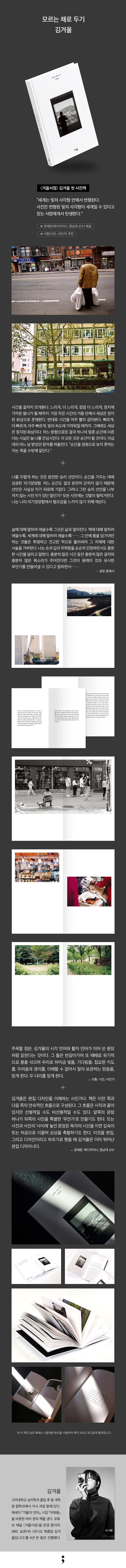 °¢±â ´Ù¸¥ Àå¼Ò, ´Ù¸¥ ½Ã°£¿¡ ÃÔ¿µÇÑ »çÁøµéÀÌ Á¶ÇüÀû, Á¤¼Àû À¯»ç¼ºÀ» µû¶ó ¸Æ¶ôÀ» ÀÌ·ç°í ÀÚ¿¬½º·¯¿î ½ÃÄö½º¸¦ Çü¼ºÇÏ¸ç µ¶ÀÚ¸¦ À̲ö´Ù. ÀÛ°¡°¡ Á¦¾ÈÇÏ´Â È帧¿¡ ¸öÀ» ¸Ã±â°í À¯À¯È÷ Èê·¯°¡´Ù°¡ ±ÛÀÌ ¹èÄ¡µÈ ÆäÀÌÁö¿¡¼´Â Àá½Ã ¸ØÃç ¼¼ È£ÈíÀ» °í¸£±â¸¦ ¹Ýº¹Çϸç, ½Ã°£À» µé¿© ¿À·¡ °¨»óÇϴ åÀÌ µÇ¾ú´Ù. ¶Ç·ÇÇϰí ÀýÁ¦µÈ ±¸¼º, ¿©¹éÀ» Á¸ÁßÇÏ´Â µðÀÚÀÎ ¶ÇÇÑ ÀÌ Ã¥ÀÇ ÀλóÀ» ´Ü´ÜÇÏ°Ô ¸¸µç´Ù. ºü¸£°Ô ¼ÒºñµÇ´Â ¼ôÆûÀÇ ½Ã´ë¿¡ ¡º¸ð¸£´Â ä·Î µÎ±â¡»´Â ¼Óµµ¸¦ ´ÊÃß°í, Àá½Ã ¸ØÃç ¼¼ ¹Ù¶óº¸´Â °æÇèÀ» Á¦¾ÈÇÑ´Ù.