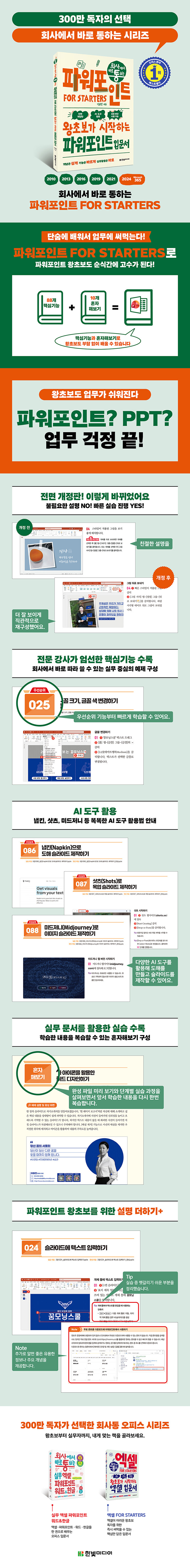 ÄÄÇ»Å͸¦ Àß ¸ð¸£°Å³ª ¿ÀÇǽº ÇÁ·Î±×·¥À» óÀ½ Á¢Çغ¸´Â µ¶ÀÚµµ ½±°Ô ¹è¿ö ½Ç¹«¿¡ Áï½Ã ½á¸ÔÀ» ¼ö ÀÖ´Â ÆÄ¿öÆ÷ÀÎÆ® Çٽɱâ´É 88°³¸¦ ¼±º°Çß´Ù. ƯÈ÷ ½½¶óÀ̵å Á¦ÀÛ¿¡ ²À ÇÊ¿äÇÑ ±â´ÉºÎÅÍ ºü¸£°Ô ÀÍÈú ¼ö ÀÖµµ·Ï 24°³ÀÇ ¿ì¼±¼øÀ§ Çٽɱâ´ÉÀ» ±¸¼ºÇØ ÆÄ¿öÆ÷ÀÎÆ® Çʼö ±â´É¸¸ ¸ÕÀú ÇнÀÇÒ ¼ö ÀÖ´Ù. ¾Õ¼ ¹è¿î Çٽɱâ´ÉÀ» Àû¿ëÇÏ¿© ½Ç¹« ½½¶óÀ̵带 Á÷Á¢ ¿Ï¼ºÇغ¸´Â 10°³ÀÇ È¥ÀÚÇØº¸±â ¿¹Á¦·Î ÆÄ¿öÆ÷ÀÎÆ® Ȱ¿ë ´É·ÂÀ» ±â¸¦ ¼ö ÀÖÀ¸¸ç, ¾î·Á¿î ±â´ÉÀº ÇÁ·¹Á¨Å×ÀÌ¼Ç Àü¹® °»çÀÎ ÀúÀÚ°¡ Ä£ÀýÇÏ°Ô ¼³¸íÇØÁÖ´Â À¯Æ©ºê °ÀÇ(ÆÄ¿öÆ÷ÀÎÆ®Æ¼Ã³)·Î Çѹø ´õ ÇнÀÇÒ ¼ö ÀÖ´Ù. ÆÄ¿öÆ÷ÀÎÆ® 2010, 2013, 2016, 2019, 2021, 2024, Microsoft 365±îÁö ´Ù¾çÇÑ ¹öÀü¿¡¼ ½Ç½ÀÇÒ ¼ö ÀÖ°í, ¹ÌµåÀú´Ï, ³ÀŲ, ¼¦Ã÷ µî AI µµ±¸¸¦ Ȱ¿ëÇÑ ÇÁ·¹Á¨Å×ÀÌ¼Ç È°¿ë¹ý±îÁö ÀÍÈú ¼ö ÀÖ´Ù.