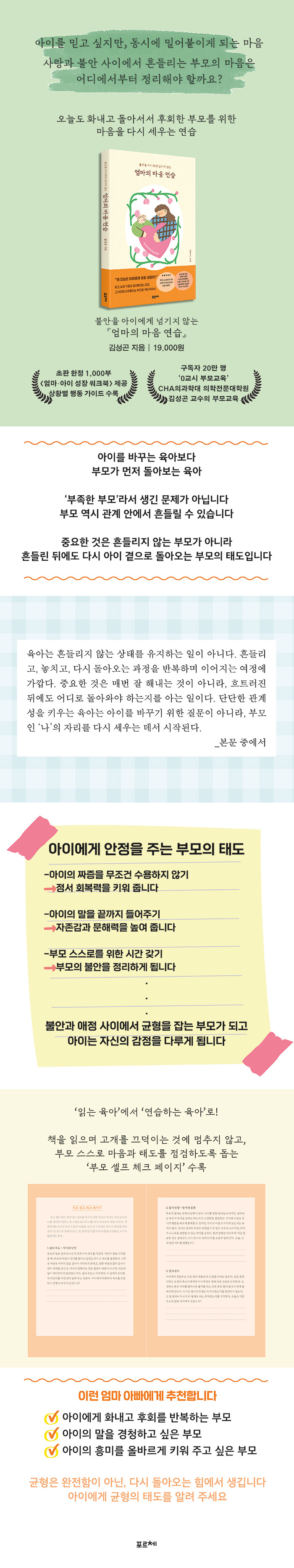 ÀúÀÚ´Â ºÎ¸ð¿¡°Ô ´õ ÀßÇ϶ó°í ¸»ÇÏÁö ¾Ê´Â´Ù. ¾ÆÀ̸¦ °íÄ¡±â Àü¿¡ ºÎ¸ðÀÇ ¸¶À½°ú ŵµ¸¦ ¸ÕÀú µ¹¾Æº¸ÀÚ°í Á¦¾ÈÇÑ´Ù. ÀÌ Ã¥Àº À°¾Æ °úÁ¤¿¡¼ ¹Ýº¹µÇ´Â ºÒ¾È°ú ÈÄȸ¸¦ ºÎ¸ðÀÇ °áÇÔÀ¸·Î ±ÔÁ¤ÇÏÁö ¾Ê°í, °ü°è¸¦ ȸº¹ÇØ ³ª°¡´Â Ãâ¹ßÁ¡À¸·Î ´Ù·é´Ù. ºÎ¸ðÀÇ °¨Á¤ »óÅÂ¿Í ¸»Åõ, °ü°è¸¦ ´ëÇϴ ŵµ°¡ ¾ÆÀÌÀÇ Á¤¼ ¾ÈÁ¤°ú ȸº¹·Â¿¡ ¾î¶² ¿µÇâÀ» ¹ÌÄ¡´ÂÁö¸¦ Â÷ºÐÈ÷ ¤À¸¸ç, ¾ÖÁ¤°ú ÅëÁ¦ÀÇ ±ÕÇü, ÀÏ»ó ¼Ó ÇнÀ°ú ÀμºÀÇ ¿¬°á, ¾ÈÁ¤ÀûÀÎ ¾ÖÂø°ú Á¤¼Àû µ¶¸³±îÁö Æø³Ð°Ô »ìÇÉ´Ù. ƯÈ÷ °¢ ÀåÀÇ ³¡¿¡ ¼ö·ÏµÈ ¡®ºÎ¸ð ¼¿ÇÁ üũ ÆäÀÌÁö¡¯¸¦ ÅëÇØ Àаí ÀÌÇØÇÏ´Â µ¥¼ ±×Ä¡Áö ¾Ê°í, ºÎ¸ð°¡ ½º½º·ÎÀÇ ¸»°ú ŵµ¸¦ Á¡°ËÇϸç À°¾ÆÀÇ ¹æÇâÀ» ´Ù½Ã ¼¼¿ï ¼ö ÀÖµµ·Ï µ½´Â´Ù. ¿Ïº®ÇÑ ºÎ¸ð¸¦ ¿ä±¸ÇÏÁö ¾Ê°í, Èçµé¸° µÚ¿¡µµ ´Ù½Ã ¾ÆÀÌ °çÀ¸·Î µ¹¾Æ¿À´Â ÈûÀ» ±â¸£´Â °Í, ±×°ÍÀÌ ÀÌ Ã¥ÀÌ ÀüÇÏ´Â À°¾ÆÀÇ ÇÙ½ÉÀÌ´Ù.