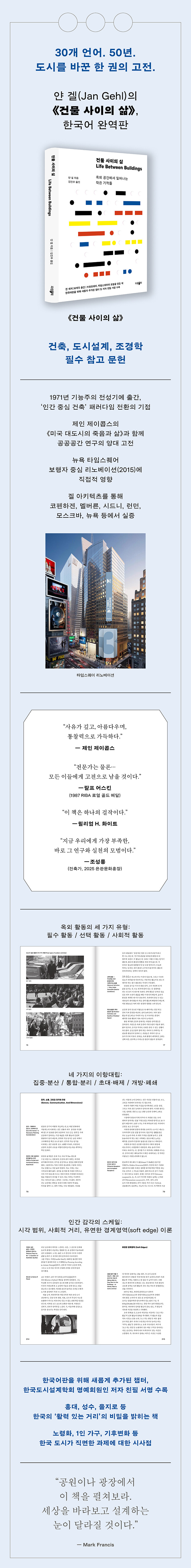 ¡¶°Ç¹° »çÀÌÀÇ »î(¿øÁ¦ Livet mellem husene. ¿µ¾îÆÇ Life Between Buildings)¡·Àº µ§¸¶Å© °ÇÃàÇÐÀÚ ¾á °Ö(Jan Gehl)ÀÇ Àú¼´Ù. 1971³â µ§¸¶Å©¾îÆÇÀÌ ³ª¿Â ÀÌ·¡ 30°³ ¾ð¾î·Î ¹ø¿ªµÇ´Â µ¿¾È µµ½Ã ¼³°è¿Í °ø°ø °ÇÃà ºÐ¾ßÀÇ »ì¾Æ ÀÖ´Â °íÀüÀ¸·Î ±× ¿µÇâ·ÂÀ» ÀÒÁö ¾Ê¾Ò´Ù. ÀÌÈÄ ¡¶»õ·Î¿î µµ½Ã °ø°£(New City Spaces)¡· µîÀÇ ÀúÀÛÀ¸·Î Ȱ¹ßÇÏ°Ô À̾îÁø ¾á °ÖÀÇ Çй®Àû ¿©Á¤Àº Áö³ 50³â ¼±¸ÀÇ ÁÖ¿ä µµ½Ãȯ°æ ±âȹ¿¡ °áÁ¤ÀûÀ¸·Î ±â¿©Çß´Ù. Çѱ¹Àο¡°Ôµµ Àͼ÷ÇÑ Å¸ÀÓ½ºÄù¾î³ª ºê·Îµå¿þÀÌ¿¡¼ ÀÌ·ç¾îÁø º¸ÇàÀÚ Á᫐ ¸®³ëº£ÀÌ¼Ç ¿ª½Ã ¾á °ÖÀÇ ÀÚ¹®¿¡ ÀÇÇÑ °á°ú¹°ÀÌ´Ù.