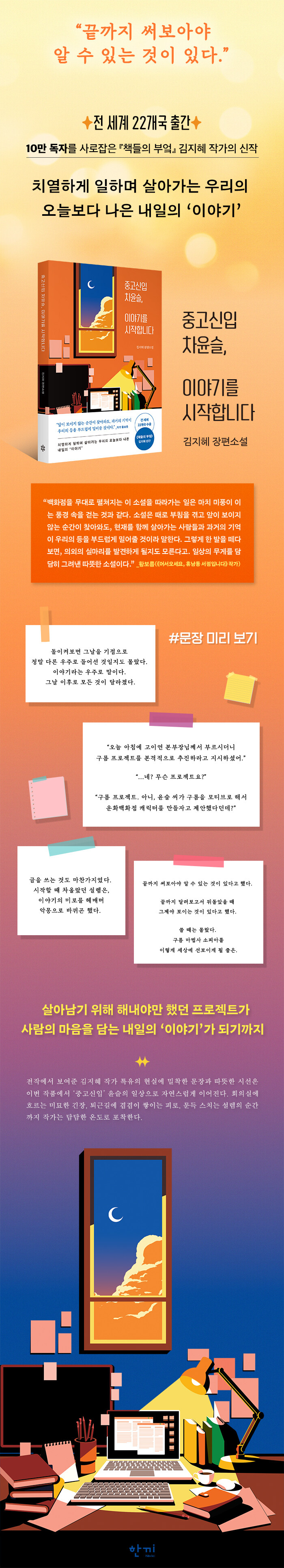 10¸¸ µ¶ÀÚÀÇ »ç¶ûÀ» ¹ÞÀ¸¸ç Àü ¼¼°è 22°³±¹¿¡¼ Àα⸦ ¾òÀº ¡¶Ã¥µéÀÇ ºÎ¾ý¡·ÀÇ ±èÁöÇý ÀÛ°¡°¡ ½Å°£ ¡¶Áß°í½ÅÀÔ Â÷À±½½, À̾߱⸦ ½ÃÀÛÇÕ´Ï´Ù¡··Î µ¹¾Æ¿Ô´Ù. ÀüÀÛ ¡¶Ã¥µéÀÇ ºÎ¾ý¡·ÀÌ ¡®Ã¥ Àб⡯·Î ¾òÀ» ¼ö ÀÖ´Â À§·Î¸¦ ´ã¾Ò´Ù¸é, ½Å°£ ¡¶Áß°í½ÅÀÔ Â÷À±½½, À̾߱⸦ ½ÃÀÛÇÕ´Ï´Ù¡·´Â ¡®±Û ¾²±â¡¯°¡ ¿ì¸®¿¡°Ô ÁÖ´Â À§·Î¿Í ¿ë±â¿¡ °üÇØ À̾߱âÇÑ´Ù. ȸ»ç¸¦ ¹è°æÀ¸·Î ÇÏÁö¸¸, ±íÀÌ µé¿©´Ùº¸¸é ÀڽŸ¸ÀÇ À̾߱⸦ ³¡±îÁö ½áº» »ç¶÷ÀÌ ¾òÀ» ¼ö ÀÖ´Â ÅëÂûÀ» ´ã¾Æ³Â´Ù. ±èÁöÇý ÀÛ°¡´Â ÀÛ°¡ÀÇ ¸»À» ÅëÇØ ¡°³»¸éÀÇ ÀڽŰú ¸¶ÁÖÇϸç Èê·Áº¸³¾ ±â¾ï°ú µÇã¾Æ¾ß ÇÒ Ãß¾ïÀ» °¡·Á³»°í, ¸¶Ä§³» ÀڽŸ¸ÀÇ ¹®ÀåÀ» ½á ³»·Á°¥ ¼ö Àֱ⸦ ¹Ù¶ú´Ù.¡±¶ó°í ¸»ÇÑ´Ù. µ¶ÀÚµéÀÌ Àú¸¶´Ù ÀÚ½ÅÀÇ À̾߱⸦ ¿ÂÀüÈ÷ »ì¾Æ³¾ Èû°ú ¿ë±â¸¦ ¾ò±æ ¹Ù¶ó´Â ÀÛ°¡ÀÇ ¸¶À½ÀÌ ÀÌ ¼Ò¼³ÀÇ ¹ÙÅÁ¿¡ ³õ¿©ÀÖ´Ù.
