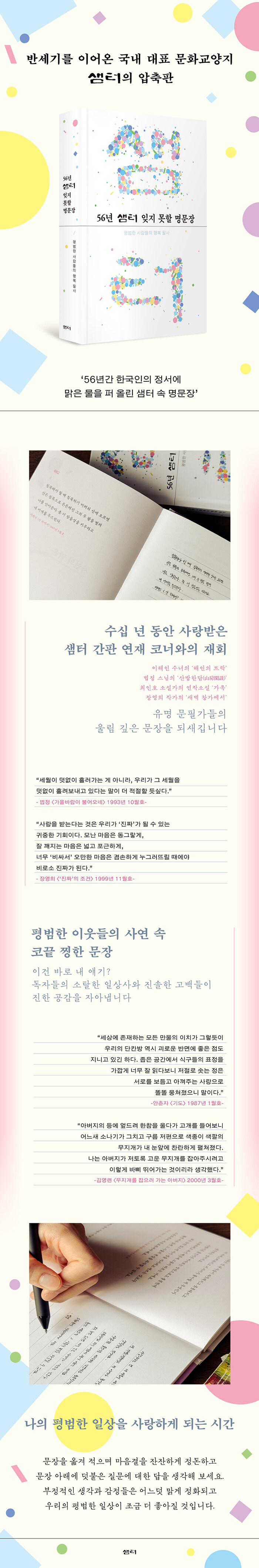 ¡¶56³â »ùÅÍ ÀØÁö ¸øÇÒ ¸í¹®Àå¡·Àº ¹Ý¼¼±â ³Ñ°Ô ¿ì¸® °çÀ» ÁöÄѿԴø <»ùÅÍ>ÀÇ ÁÖ¿Á°°Àº ¹®ÀåµéÀ» ¼ÕÀ¸·Î µû¶ó ¾²°í, ¸¶À½ ±íÀÌ »õ±â´Â ÇÊ»çÁýÀÌ´Ù. 1970³â 4¿ù¿¡ â°£ÇÏ¿© ¸Å´Þ ¹ß°£µÈ 671±ÇÀÇ ÀâÁö ¼Ó ¼ö¸¸ °³ÀÇ ±Û Áß¿¡¼ °í¸£°í °í¸¥ ¹®ÀåµéÀ» ÇÑ ±ÇÀ¸·Î ¿«¾ú´Ù. °¡È÷ 56³âÀÇ ¼¼¿ùÀ» ´ãÀº ¡®»ùÅÍ ¾ÐÃàÆÇ¡¯À̶ó°í ÇÒ ¸¸ÇÏ´Ù.