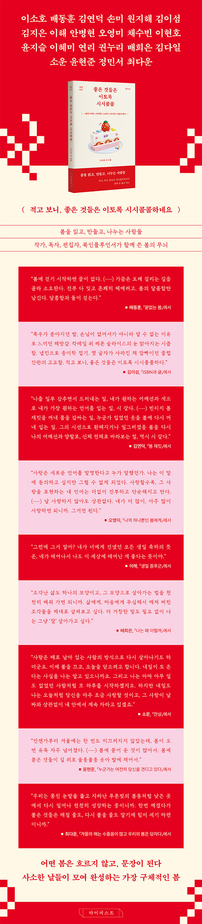 ¼¼»óÀÌ ¿ÂÅë ²É°ú ½ÃÀÛÀ» À̾߱âÇÒ ¶§, Àڱ⸸ÀÇ ¹æ¿¡¼ ¡®ÁøÂ¥ º½¡¯À» ±â·ÏÇÑ »ç¶÷µéÀÌ ÀÖ´Ù. ½º¹°µÎ ¸íÀÇ ÀúÀÚ°¡ ¿Â¸öÀ¸·Î º½À» Åë°úÇÏ¸ç ³²±ä ±× ¿¹¼ø¿©¼¸ ÆíÀÇ ±â·ÏÀ» ¿«¾ú´Ù. °¡Àå ¼ÖÁ÷Çϰí Á¤Á÷ÇÑ Çü½ÄÀÎ Àϱâ·Î ¾´ À̾߱âµéÀº º½À̶ó´Â °èÀýÀ» ¸·¿¬ÇÑ ³¶¸¸À¸·Î Æ÷ÀåÇÏÁö ¾Ê´Â´Ù. ´ë½Å º½ºµ ¾Æ·¡¼ ´õ¿í £¾îÁö´Â ±×¸²ÀÚ¿Í ²ÉÀÙÀÌ ¶³¾îÁø ÀÚ¸®¿¡ ³²Àº ±¸Ã¼ÀûÀÎ »ýȰÀ» °¡¸¸È÷ ¾î·ç¸¸Áø´Ù. ¸¸°³ÇÑ ²Éº¸´Ù ´õ ¹¶Å¬ÇÑ, ¹¬¹¬È÷ °ßµð°í »ì¾Æ³»´Â À̵éÀÇ Ã¼¿ÂÀ¸·Î.