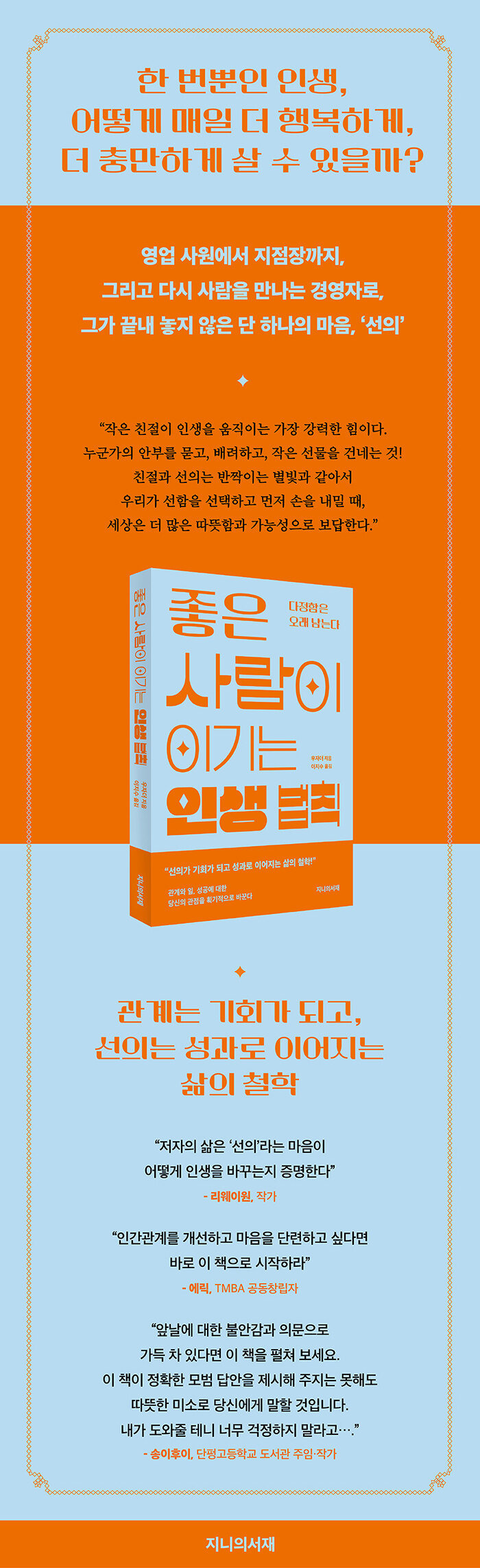 ¸¸¾à Áö±Ý ´ç½ÅÀÇ »îÀÌ ¸·Èù °ñ¸ñ±æ °°´Ù¸é, »ç¶÷°úÀÇ °ü°è ¼Ó¿¡¼ ±æÀ» ÀÒ¾ú´Ù°í ´À²¸Áø´Ù¸é, Àá½Ã ¸ØÃç ¼¼ ÀÌ Ã¥ÀÌ ¸»ÇÏ´Â ¼±ÀÇÀÇ ¼±¼øÈ¯¿¡ ÁÖ¸ñÇØ º¸±æ ±ÇÇÑ´Ù. ÂøÇÑ ¸¶À½Àº »ç¶óÁöÁö ¾Ê´Â´Ù. ´Ù¸¸, ´õ Å« ¸ð½ÀÀ¸·Î µ¹¾Æ¿Ã »ÓÀÌ´Ù.