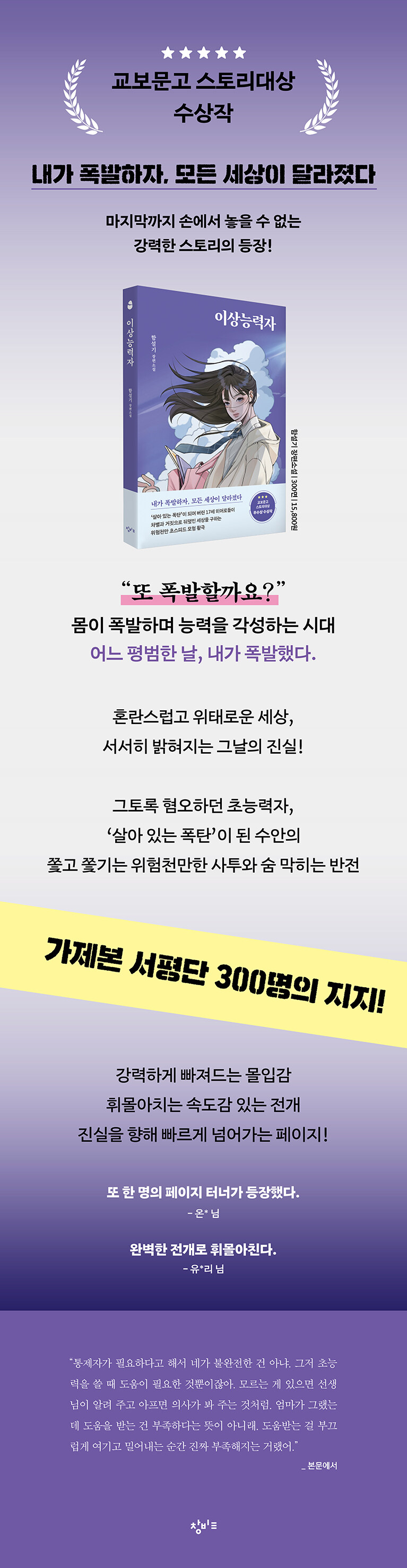 ±³º¸¹®°í ½ºÅ丮´ë»ó ¼ö»óÀÛÀÌÀÚ Ã¢ºñ±³À° ¼ºÀå¼Ò¼³ ½Ã¸®Áî ¿¿©¼¸ ¹øÂ° ÀÛǰÀÎ ¡ºÀÌ»ó´É·ÂÀÚ¡»´Â »çÃá±â û¼Ò³âµéÀÌ ¿¹°í ¾øÀÌ ÃÊ´É·ÂÀ» °®°Ô µÇ´Â ±Ù¹Ì·¡ Çѱ¹À» ¹è°æÀ¸·Î ÆîÃÄÁö´Â º»°Ý K-È÷¾î·Î ¼ºÀå ½ºÅ丮ÀÌ´Ù. ÃÊ´É·ÂÀÚ Æø¹ß »ç°í·Î ¾ö¸¶¸¦ ÀÒÀº µÚ ¡®ÃÊ´É·ÂÀÚ °Ý¸®ÆÄ¡¯¿¡ µ¿Á¶ÇؿԴø 17¼¼ ¼ö¾ÈÀº ¾î´À ³¯ ¡®´ë°¢¼º¡¯À» °ÞÀ¸¸ç ÀÚ½ÅÀÌ °¡Àå Çø¿ÀÇÏ´ø Á¸Àç, ¹Ù·Î ÃÊ´É·ÂÀÚ°¡ µÈ´Ù. ±×´Â Ä£±¸ ¿°¿ìÁ¤, ³²¿¹¸®¿Í ¿¬´ëÇÏ¸ç ¾ö¸¶ÀÇ Á×À½¿¡ ¾ôÈù Áø½ÇÀ» ÃßÀûÇϰí, °Å´ëÇÑ ºô·±°ú ¸Â¼±´Ù. ÇÔ¼³±â ÀåÆí¼Ò¼³ ¡ºÀÌ»ó´É·ÂÀÚ¡»´Â ¿¹»óÄ¡ ¸øÇÑ ¹ÝÀü, ½¯ »õ ¾øÀÌ ÆîÃÄÁö´Â ºü¸¥ Àü°³·Î ¸¶Áö¸· Àå±îÁö ´Ü¼û¿¡ ÀÐÈ÷´Â ¸ôÀÔ°¨À» ¼±»çÇÑ´Ù.