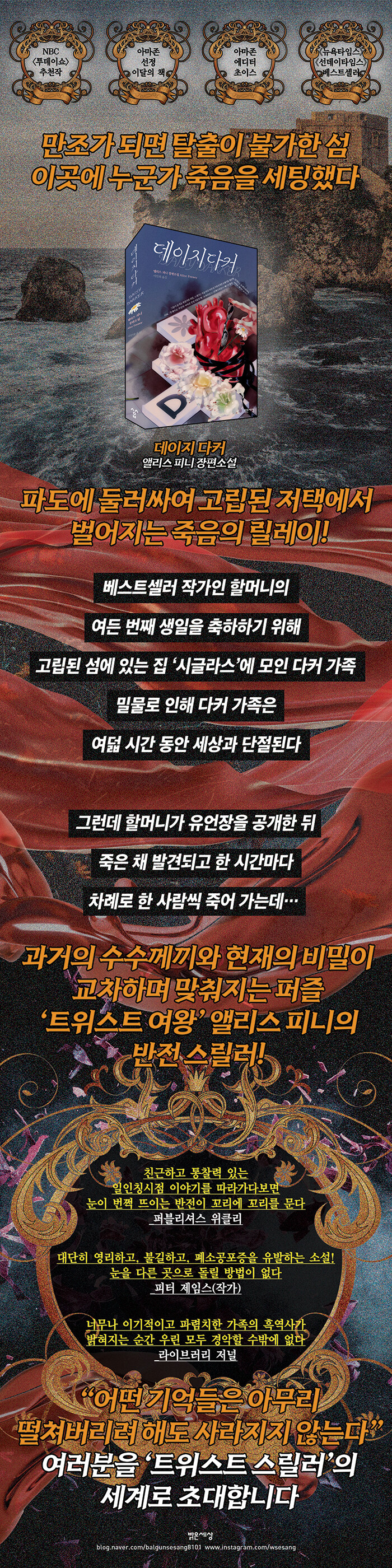 ¡¶µ¥ÀÌÁö ´ÙÄ¿¡·´Â Ãâ°£ ´ç½Ã NBC ¡´Åõµ¥À̼¿¡ ¼Ò°³µÇ¸ç ÈÁ¦¸¦ ¸ð¾Ò´Ù. ´ÙÄ¿ °¡ »ç¶÷µéÀÌ ¼û°Ü¿Â ¾îµÎ¿î ºñ¹Ð, ¹ÝÀü °¡µæÇÑ ³»¿ë, ¼Ò¸§ ³¢Ä¡´Â ÀüÀ²°ú ¿À½ÏÇÑ °øÆ÷¸¦ ´À³¥ ¼ö ÀÖ´Â ½º¸±·¯´Ù. ¿Ïº®ÇÑ ¸ôÀÔÀ» °æÇèÇÏ°Ô ¸¸µå´Â ½ºÅ丮, ½Ã¼±À» ³õÀ» ¼ö ¾ø°Ô ÇÏ´Â Àü°³, ¼¶¶àÇÏ°í ³î¶ó¿î ¹ÝÀüÀÌ ²¿¸®¸¦ ¹®´Ù. ÀÌ ¼Ò¼³Àº µîÀåÀι° Áß½ÉÀÇ À̾߱⸦ ´Ù·ç°í ÀÖÀ¸¸ç º¹ÀâÇÑ ÆÛÁñó·³ ½Ç¸¶¸®¸¦ ã±â ½±Áö ¾ÊÀº ±¸¼ºÀÌ´Ù. ¾îµÓ°í À½¿ïÇϸ鼵µ µ¿½Ã¿¡ µ¶Æ¯Çϰí À¸½º½ºÇÑ ºÐÀ§±â°¡ ¸Å·ÂÀûÀÌ´Ù. ¾Ù¸®½º ÇÇ´Ï´Â À̾߱⸦ ²¿°í ºñÆ®´Â Àü°³¿¡ ´ÉÇÑ ÀÛ°¡·Î ¾Ë·ÁÁ® ÀÖ°í, ±×·± ¼ºÇâÀ» ¹Ý¿µÇØ ¡®Æ®À§½ºÆ®ÀÇ ¿©¿Õ¡¯À̶ó ºÒ¸®°í ÀÖ´Ù. º¯È¹«½ÖÇÑ ³»¿ë Àü°³¿Í ³î¶ó¿î ¹ÝÀüÀº ¾Ù¸®½º ÇÇ´ÏÀÇ Àü¸ÅƯÇ㳪 ´Ù¸§¾ø´Ù.
