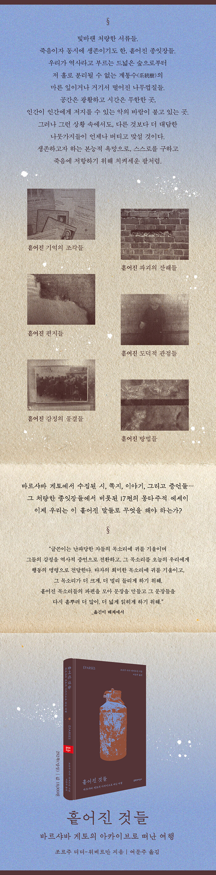 ¡ºÈð¾îÁø °Íµé¡»Àº ºÒ°¡´ÉÇÑ °áÇÌÀÇ ¾ð¾î·Î, ±×·³¿¡µµ ºÒ±¸ÇÏ°í ¾²°í¾ß ¸»°Ú´Ù´Â °íÅ뽺·¯¿î ´ÙÁüÀ¸·Î ¾²ÀÎ ±ÛÀÌ´Ù. ÀúÀÚ´Â °øÀû ±â·Ï¿¡¼ ¹èÁ¦µÈ ±â·Ïµé, °ÇÑ ºû¿¡ ÀÇÇØ °¡·ÁÁø »îÀÇ ±â·Ïµé, ¼öÅ»µÇ°Å³ª ÆÄ±«µÇ¾î ´Ã Èð¾îÁö°í ÀÖ´Â ±â·Ïµé¿¡ ÁÖ¸ñÇÑ´Ù. ¡°±×·±µ¥ ÀÌÁ¦ ¿ì¸®´Â, ±ÛÀÚ°¡ °ÅÀÇ Áö¿öÁø ÀÌ Á¾ÀÕÁ¶°¢µé·Î, ÀÌ Èð¾îÁø ¸»µé·Î ¹«¾ùÀ» ÇØ¾ß ÇÒ °ÍÀΰ¡? ±×°ÍµéÀ» ºÒº¯ÀÇ º¸¹°·Î °£Á÷ÇÒ °ÍÀÌ ¾Æ´Ï¶ó, ÇöÀç¿Í ¹Ì·¡¸¦ À§ÇÑ ¾¾¾ÑÀ¸·Î »ï¾Æ¾ß ÇÒ °ÍÀÌ´Ù.¡± µðµð-À§º£¸£¸¸¿¡ µû¸£¸é, Èð¾îÁüÀº ¾¾ »Ñ¸®´Â ÇàÀ§¸¦ ¿¬»ó½ÃŲ´Ù. ±×¸®°í ±× Èð¾îÁø °ÍµéÀº °í¸³ ¼Ó¿¡¼ Á×À½¿¡ ³»¸ô¸®´Â ¸ðµç ¹ÎÁßµéÀ» À§ÇØ, ¹Ì·¡ÀÇ »ýÁ¸À» À§ÇØ ½ÏÆ·¿ö¾ß ÇÒ ¾¾¾ÑÀÌ´Ù. ±×·¸´Ù¸é, ¿À´Ã³¯ ºñ±ØÀÌ ¹Ýº¹µÇ°í ÀÖ´Â ÀÌ ¼¼°è¸¦ ¸¶ÁÖÇÏ¸ç ¿ì¸®´Â ¹«¾ùÀ» ±â¾ïÇϰí, ¶Ç ¾î¶² ŵµ¸¦ ÃëÇØ¾ß ÇÒ±î? ´ë¹®ÀÚ ¿ª»ç¿¡ ¾²ÀÌÁö ¾Ê´Â ¾àÀÚµéÀÇ Èð¾îÁø ¸ñ¼Ò¸®¸¦ µå·¯³»´Â ÀÛ¾÷, ¡°¼Ò¼öÀÚµéÀÇ ¼Ò¼ö ¹®ÇС±À» ÆîÃij»°íÀÚ ÇÑ ÀÌ Ã¥À» ¹ÝÀüÀÇ ¸Þ½ÃÁö·Î Àо ¼öµµ ÀÖÀ» °ÍÀÌ´Ù.