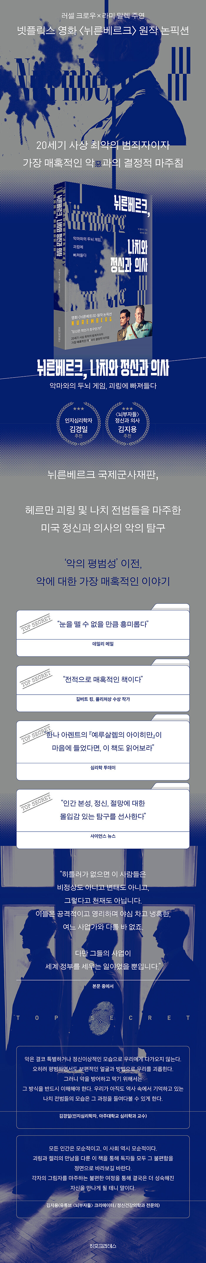 ·¯¼¿ Å©·Î¿ì, ¶ó¹Ì ¸»·º ÁÖ¿¬ÀÇ ¿µÈ ¡´´µ¸¥º£¸£Å©¡µ·Î ¿µÈÈµÈ ¿øÀÛ ³íÇȼÇÀÎ Àè ¿¤ÇÏÀÌÀÇ ¡º´µ¸¥º£¸£Å©, ³ªÄ¡¿Í Á¤½Å°ú Àǻ硻(¿øÁ¦: The Nazi and the Psychiatrist: Hermann Goring, Dr. Douglas M. Kelley, and a Fatal Meeting of Minds at the End of WWII)´Â ¾ÇÀÇ Á߽ɿ¡ °¡Àå °¡±îÀÌ ´Ù°¡°¬´ø Á¤½Å°ú ÀÇ»ç ´õ±Û·¯½º Ä̸®ÀÇ À̾߱⸦ ´Ù·é´Ù. ´µ¸¥º£¸£Å© ±¹Á¦±º»çÀçÆÇÀÇ ¾ç»ó¿¡ ÁýÁßÇÑ ¿µÈ¿Í ´Þ¸® Ã¥Àº Ä̸®°¡ °æÇèÇÑ Ç츣¸¸ ±«¸µ µî 22¸í Àü¹üµéÀÇ ½É¸®¿Í Çൿ, ±×¸®°í ±×µéÀÇ ¸¶Áö¸· ¸ð½ÀÀ» Áý¿äÇÏ°Ô µÚÂѴ´Ù. ¶ÇÇÑ ¿µÈ¿¡¼ »ý·«µÈ ±¹Á¦±º»çÀçÆÇ ÀÌÈÄ Ä̸®°¡ °æÇèÇÑ ¶Ç ´Ù¸¥ ¾ÇÀÇ ¸ð½À°ú ÆÄ±¹Àû °á¸»À» ÃßÀûÇϸç Áö±Ý ¿ì¸® ½Ã´ë¿¡ ´Ù½Ã±Ý µÇ»õ°Ü¾ß ÇÒ ¾Ç¿¡ ´ëÇÑ ÇÑ °üÁ¡°ú ±× ÆÄ±«Àû ÀÏ»ó¼ºÀ» ÀλóÀûÀ¸·Î Á¦½ÃÇÑ´Ù.