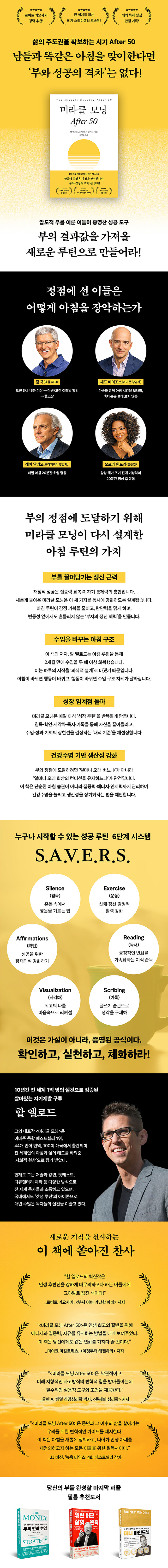 Àü ¼¼°è ¼ö¹é¸¸ ¸íÀÇ »îÀ» ¹Ù²Û ¾ÆÄ§ ½À°ü Çõ¸í, ¡º¹Ì¶óŬ ¸ð´×¡»ÀÌ ÀÌÁ¦ 50¼¼ ÀÌÈÄÀÇ »îÀ» À§ÇÑ »õ·Î¿î ¿©Á¤À¸·Î µ¹¾Æ¿Ô´Ù. ¡®¹Ì¶óŬ ¸ð´×¡¯ÀÇ Ã¢½ÃÀÚ ÇÒ ¿¤·ÎµåÀÇ ÈļÓÀÛ ¡º¹Ì¶óŬ ¸ð´× After 50¡»Àº ´Ü¼øÈ÷ ´õ À̸¥ ±â»óÀ» ±ÇÇϴ åÀÌ ¾Æ´Ï´Ù. ÀÌ Ã¥Àº ÀλýÀÇ ÈĹݺθ¦ ´õ ±í°í Ãæ¸¸ÇÏ°Ô º¸³»´Â °Í°ú µ¿½Ã¿¡ °¡Àå Áß¿äÇÑ ¼º°ø°ú ºÎÀÇ Á¤Á¡¿¡ µµ´ÞÇϱâ À§ÇØ ÇÊ¿äÇÑ »îÀÇ Åµµ¿Í ½Çõ¹ýÀ» ¾È³»ÇÑ´Ù. ƯÈ÷ ¡°´©±¸³ª ½ÃÀÛÇÒ ¼ö ÀÖ´Â ¼º°ø ·çƾ 6´Ü°è, S.A.V.E.R.S¡±¸¦ ½Ã½ºÅÛÀ¸·Î Á¦¾ÈÇϰí Àִµ¥, ÀÌ´Â Silence(ħ¹¬), Affirmations(È®¾ð), Visualization(½Ã°¢È), Exercise(¿îµ¿), Reading(µ¶¼), Scribing(±â·Ï)ÀÌ´Ù. À̰ÍÀº °¡¼³ÀÌ ¾Æ´Ï¶ó Áõ¸íµÈ °ø½ÄÀ¸·Î¼ È®ÀÎÇÏ°í ½ÇõÇϰí üÈÇϸé, ³²µé°ú ´Ù¸¥ °ÝÂ÷¸¦ ¸¸µé¾î »îÀÇ ÁÖµµ±ÇÀ» È®º¸ÇÒ ¼ö ÀÖ´Ù.