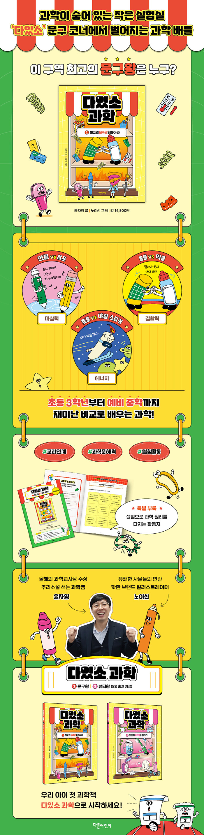 ´ÙÀÖ¼Ò ½Ã¸®Áî´Â ÃʵîÇлýµéÀÌ »ýȰ¿ëǰ »óÁ¡¿¡¼ Áñ°Ü ã´Â ¹°°Ç µÎ °³¾¿À» ¦Áö¾î, ±× ¾È¿¡ ¼ûÀº °úÇÐ ¿ø¸®¸¦ ½±°í Èï¹Ì·Ó°Ô ¼Ò°³ÇÏ´Â ±³¾ç °úÇÐÃ¥ÀÔ´Ï´Ù. ±×Áß¿¡¼µµ ù ±Ç ¡º´ÙÀÖ¼Ò °úÇÐ 1: ¹®±¸¿ÕÀ» »Ì¾Æ¶ó¡»´Â ¾ÆÀ̵éÀÌ °¡Àå ½±°Ô Á¢ÇÒ ¼ö Àִ ģ¼÷ÇÑ ¹®±¸µéÀ» ÅëÇØ ÃÊµî °úÇÐ °³³äÀ» ÀÚ¿¬½º·´°Ô ÀÍÈ÷µµ·Ï ÇÕ´Ï´Ù. ¹°°ÇÀÇ °Ñ¸ð½ÀÀ» ³Ñ¾î ±¸Á¶¿Í °úÇÐ ¿ø¸®¿¡ ÁÖ¸ñÇÏ°Ô ÇÔÀ¸·Î½á, ¾î¸°À̵éÀÌ »ýȰ ¼Ó °úÇÐ °³³äÀ» ¹ß°ßÇϰí Ž±¸ÇÏ´Â ´«À» ±â¸¦ ¼ö ÀÖµµ·Ï µµ¿ÍÁÝ´Ï´Ù. ƯÈ÷ ÃʵîÇб³ 3~6Çг⠰úÇÐ ±³°ú °úÁ¤°ú ¿¬°áµÇ¸ç, ÀϺΠÀå¿¡¼´Â ÁßÇб³ ¼öÁØÀÇ °³³ä±îÁö »ì¦ ¾Æ¿ì¸£¸ç(¼±Çà ÇнÀ) È£±â½É ±â¹ÝÀÇ ÀÚ¿¬½º·¯¿î °úÇÐ ÀÔ¹®À» À¯µµÇÕ´Ï´Ù.