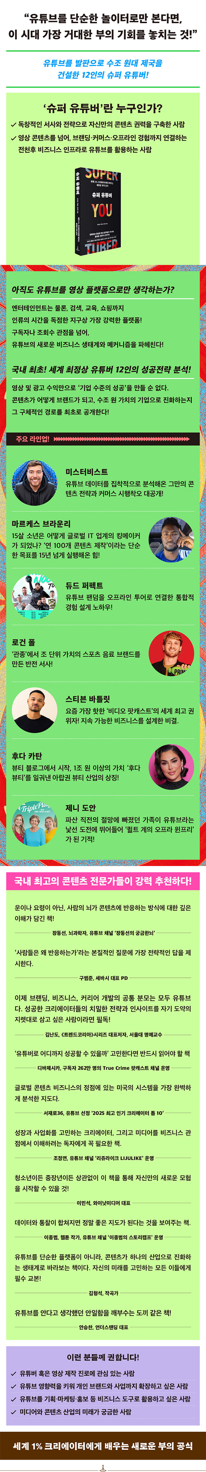 01. ¹Ì½ºÅͺñ½ºÆ®(MrBeast): Àü ¼¼°è 1À§ À¯Æ©¹ö. À¯Æ©ºê µ¥ÀÌÅ͸¦ ÁýÂøÀûÀ¸·Î ºÐ¼®, ¿¬ ¸ÅÃâ 1Á¶ ¿ø´ë¸¦ ¹Ù¶óº¸´Â ¡®ÄÜÅÙÃ÷ Á¦±¹¡¯À» ¼³°èÇÏ´Ù.