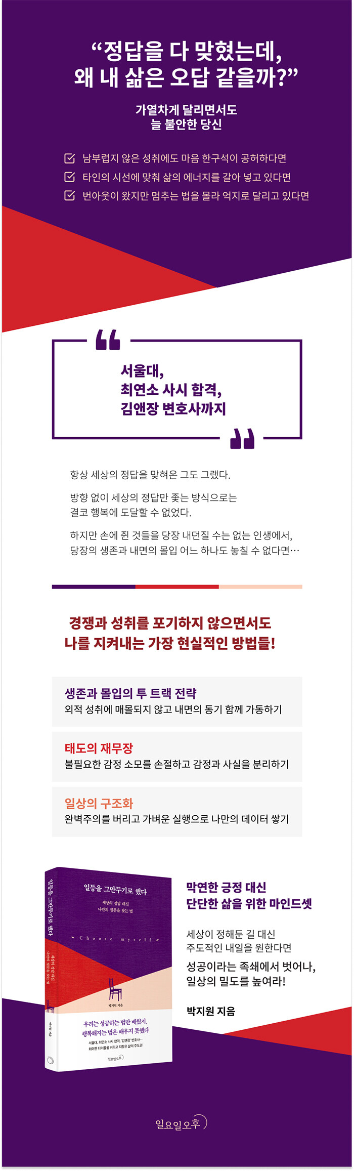 ÁÁÀº ´ëÇÐ, ¾ÈÁ¤ÀûÀÎ Á÷Àå, ³ôÀº ¿¬ºÀ. ¼¼»óÀº ¿ì¸®¿¡°Ô ¼º°øÇÏ´Â ¹ý, Á¤´äÀ» ¸ÂÈ÷´Â ¹ýÀ» °¡¸£ÃĿԴÙ. ±× °ø½ÄÀ» Ãæ½ÇÈ÷ µû¶ó¿Â ÀúÀÚ´Â ¼¿ï´ë ÁøÇÐ, ÃÖ¿¬¼Ò »ç¹ý½ÃÇè ÇÕ°Ý, ±×¸®°í ´ëÇѹα¹ ÃÖ°í ·ÎÆß º¯È£»ç¶ó´Â ŸÀÌÆ²À» °Å¸ÓÁã¾ú´Ù. ±×·¯³ª ¸ðµç ¸ñÇ¥¸¦ ´Þ¼ºÇÑ ±× °íÁö¿¡¼ ÀúÀÚ¸¦ µ¤Ä£ °ÍÀº ¼ºÃë°¨ÀÌ ¾Æ´Ï¶ó ¹ø¾Æ¿ô°ú °øÇãÇÔÀ̾ú´Ù.