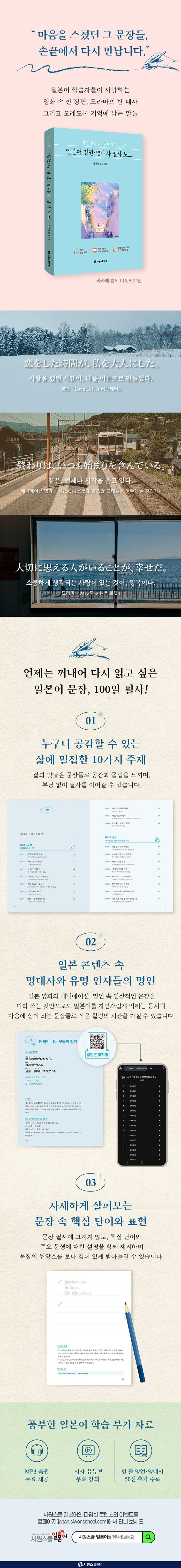 ÀϺ» ¿µÈ, µå¶ó¸¶, ¾Ö´Ï¸ÞÀ̼ǰú ´Ù¾çÇÑ ºÐ¾ßÀÇ À¯¸í ÀλçµéÀÌ ³²±ä ÀλóÀûÀÎ ¸í´ë»ç¿Í ¸í¾ðÀ» ¼±º°ÇØ ÇÑ ±Ç¿¡ ´ã¾Ò½À´Ï´Ù. ÀϺ» ¾Ö´Ï¸ÞÀ̼ǰú ¿µ»ó ÄÜÅÙÃ÷¿¡ °ü½ÉÀÌ ¸¹Àº ÀϺ»¾î ÇнÀÀÚµéÀÇ ÃëÇâÀ» °í·ÁÇØ, ÀÚ½ÅÀÌ ÁÁ¾ÆÇÏ´Â ÄÜÅÙÃ÷ ¼Ó ¹®ÀåÀ» µû¶ó ¾²¸ç ÀϺ»¾î¸¦ ¹è¿ì´Â Áñ°Å¿òÀ» ´À³¥ ¼ö ÀÖµµ·Ï ±¸¼ºÇß½À´Ï´Ù.